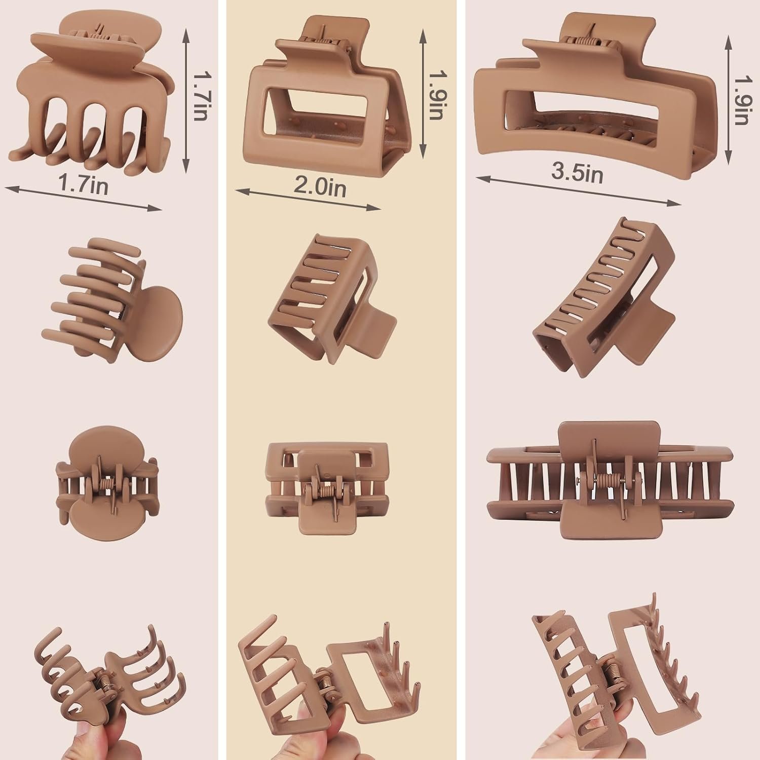 12Pcs Hair Claw Clip Set: Featuring 3 distinct styles and 3 different sizes to meet your everyday needs. Small Claw Clips: 1.7 x 1.8 Inch, Medium Square Hair Claw Clips: 2 x 1.8 Inch, Large Square Hair Clips: 3.5 x 2 Inch