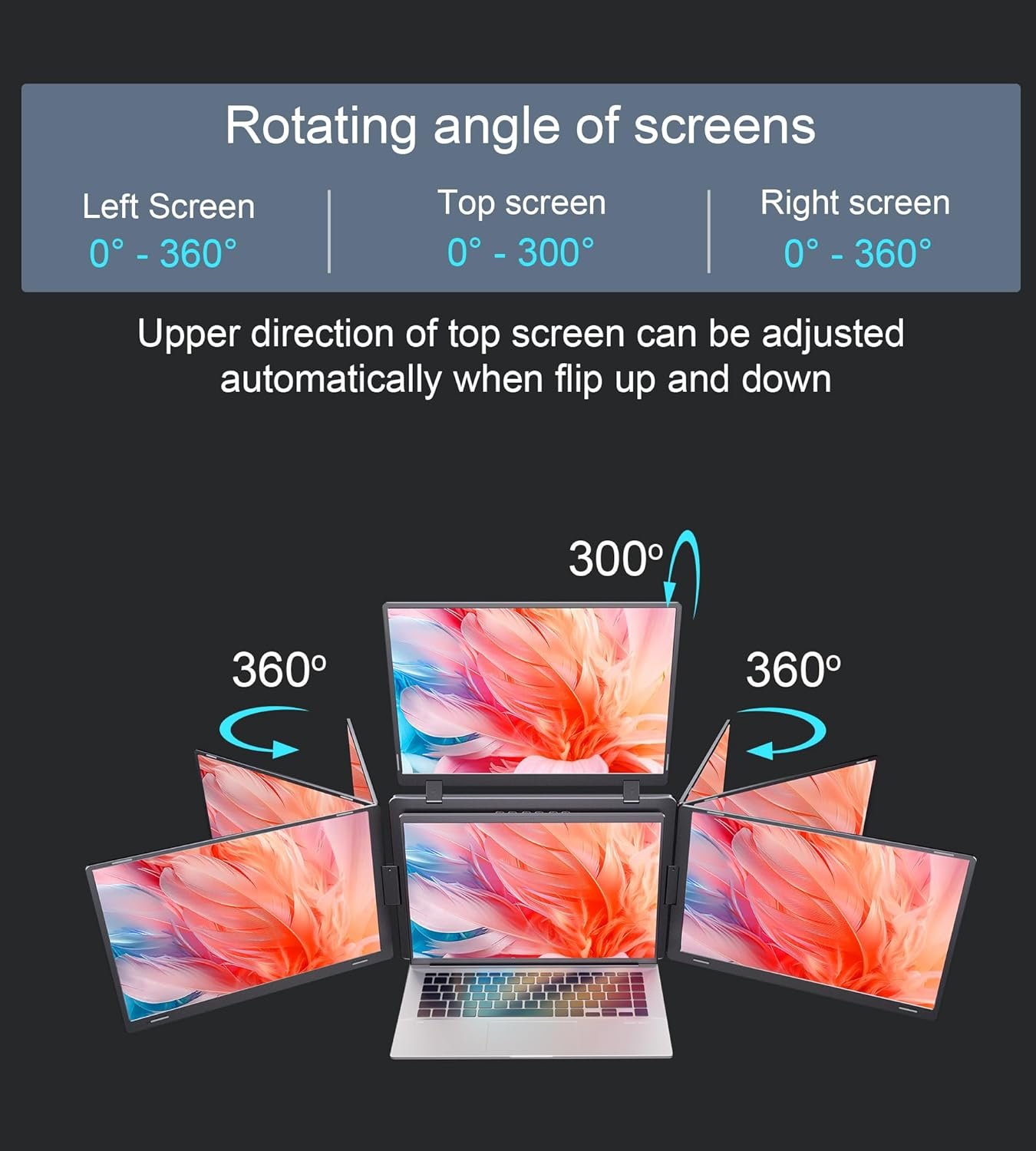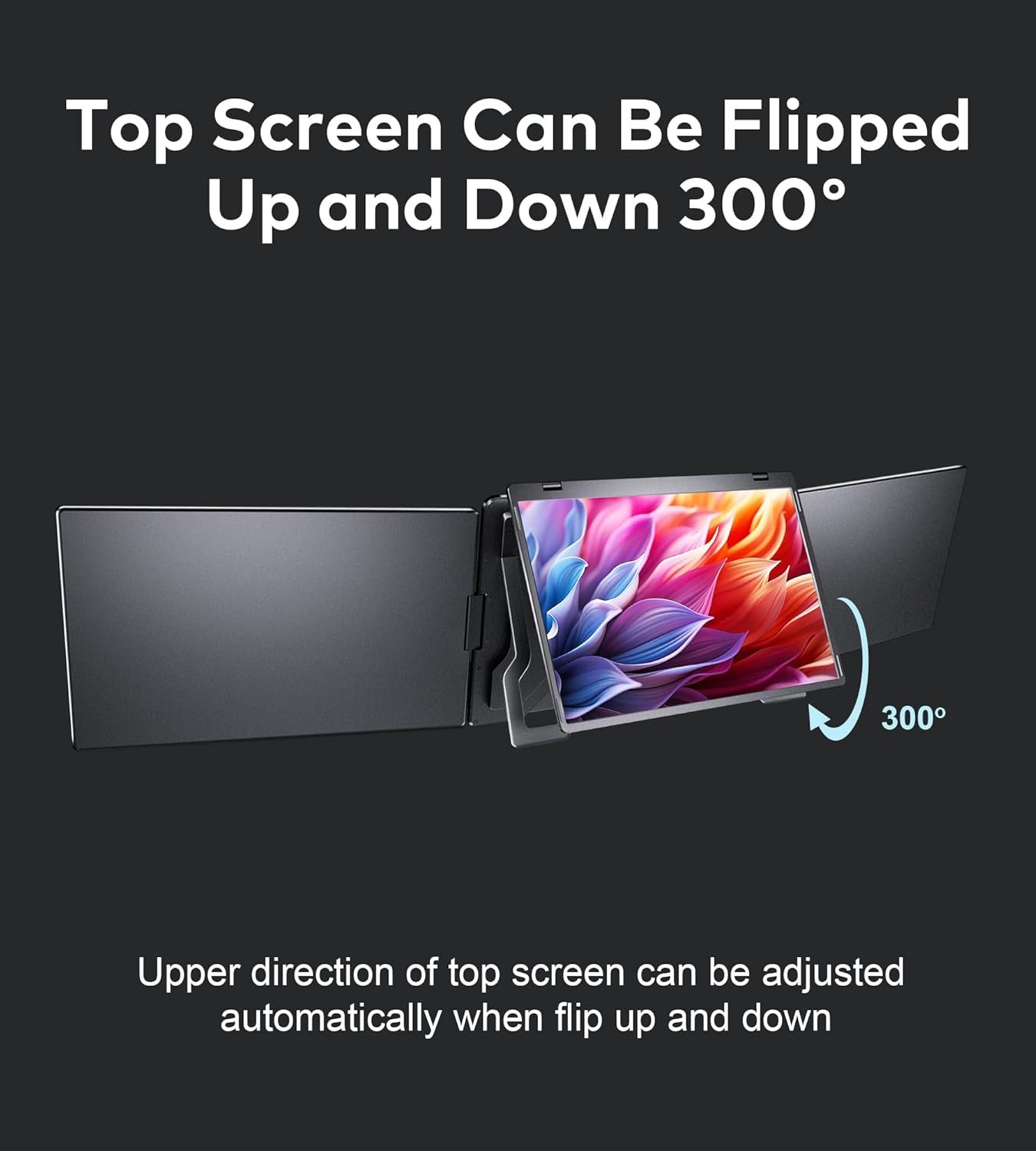 Adjustable screen with auto-rotation: Ultra-flexible top screen auto-rotates when folded backward, supports 300° angle adjustment. No manual settings—tilt and display optimizes itself, reducing neck/eye strain for coding, analysis, or video calls.