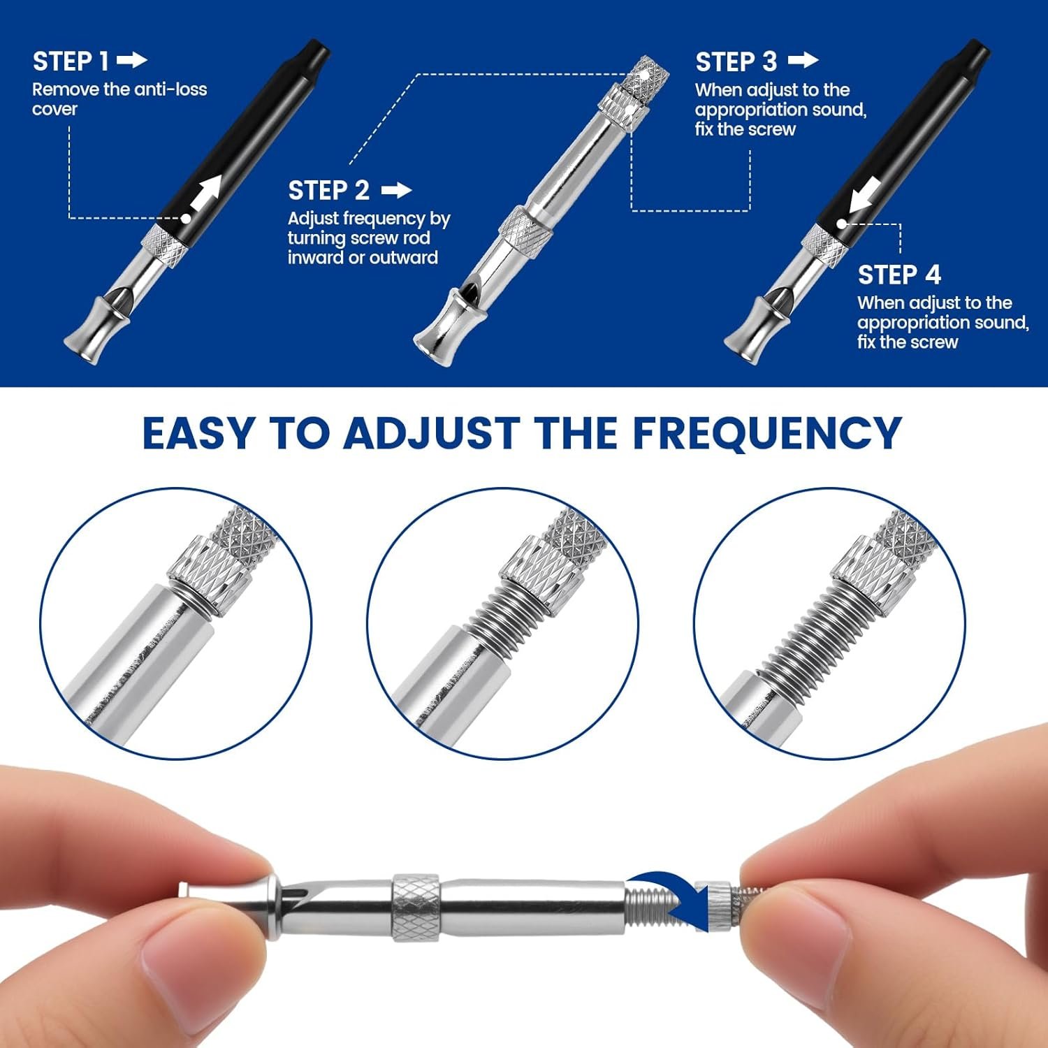 Precise Frequency Adjustment: Easily find the perfect pitch for your dog’s hearing. By simply turning the integrated screw, you can fine-tune the frequency and observe your dog’s reaction to discover the most noticeable and responsive setting for effective training.