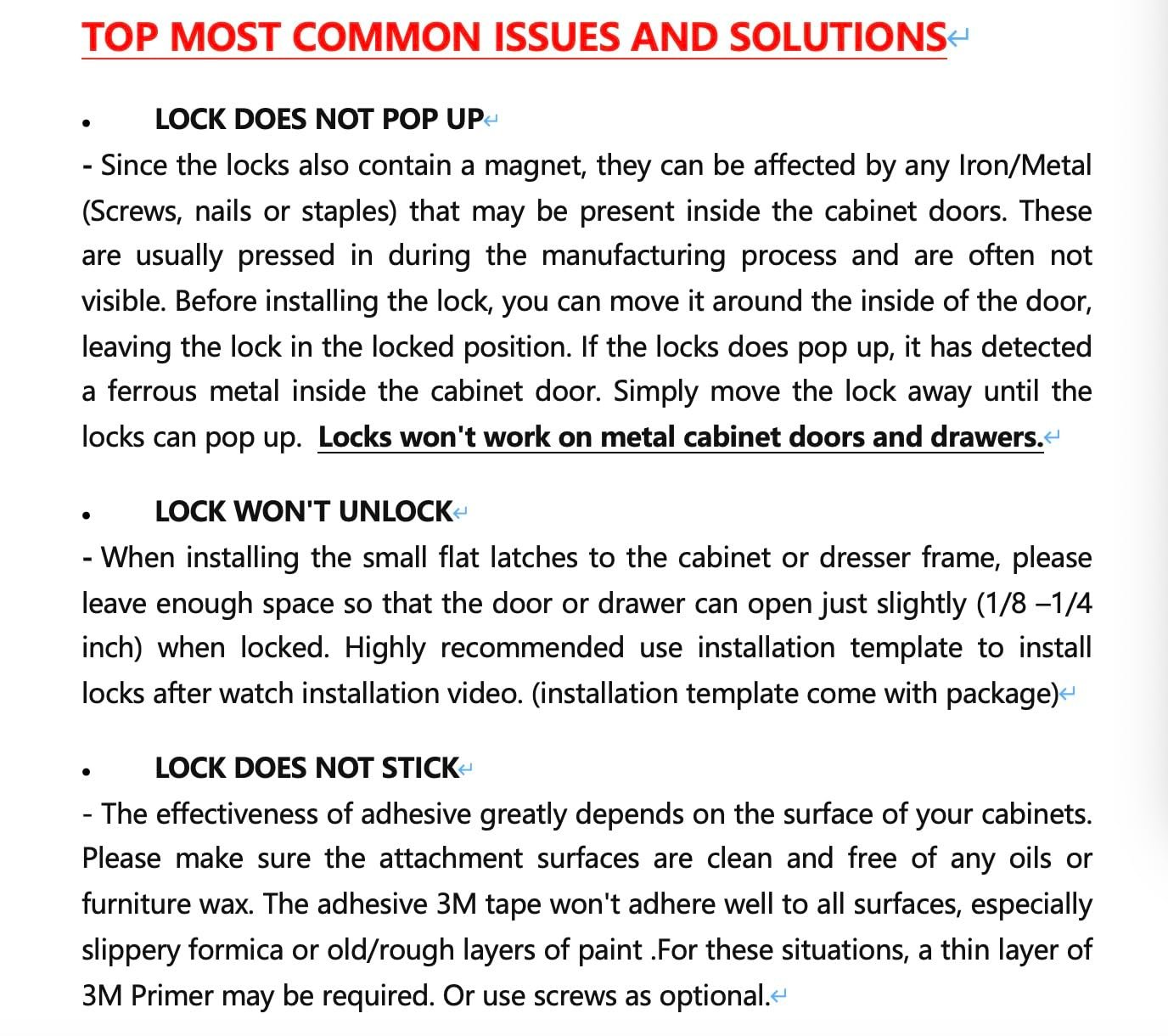 [ INSTALLATION TIPS] The locks can be affected by any Iron/Metal (Screws, nails or staples) that may be present inside the cabinet doors, and not visible. Before installing the lock with the adhesive, move it around the inside of the door, leaving the lock in the locked position. If the locks does not pop up, it has detected a ferrous metal inside the cabinet door. Simply move the lock away until the locks can pop up, and install the lock in that position.