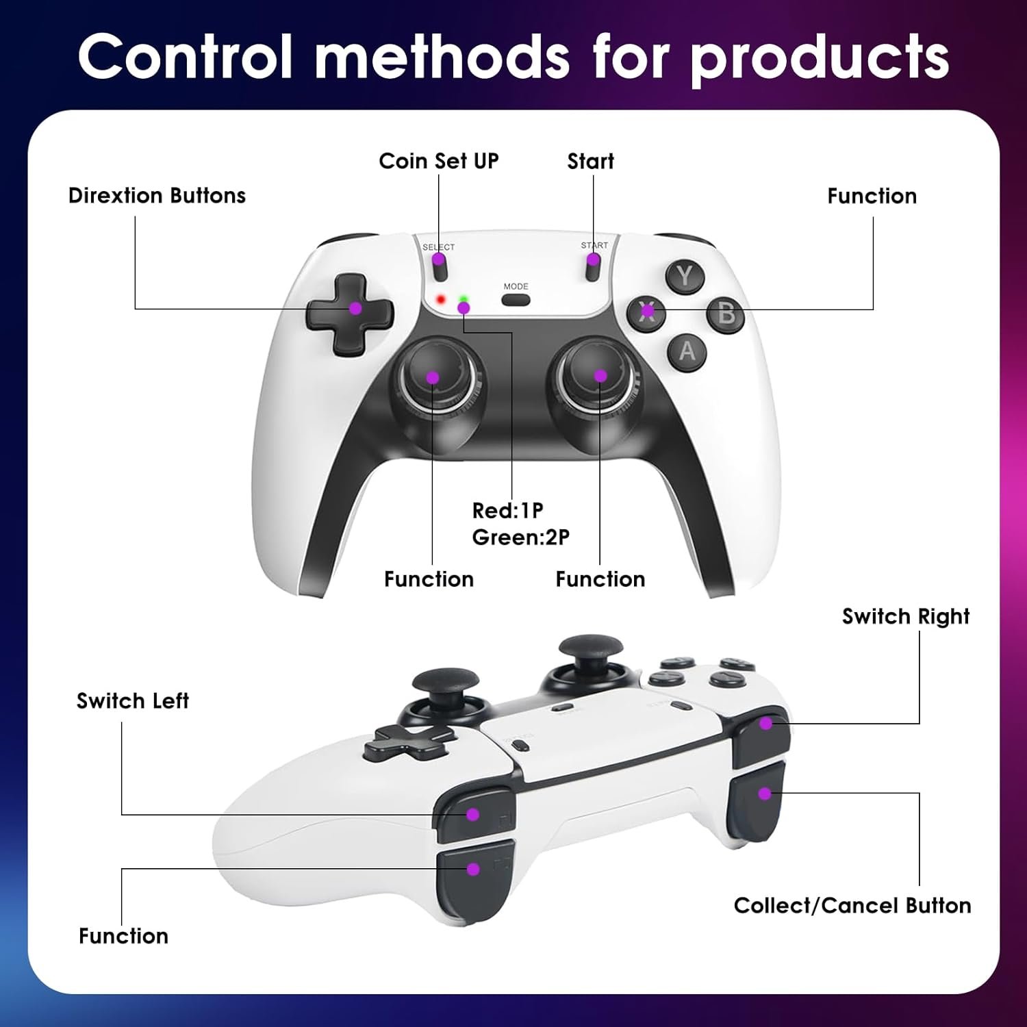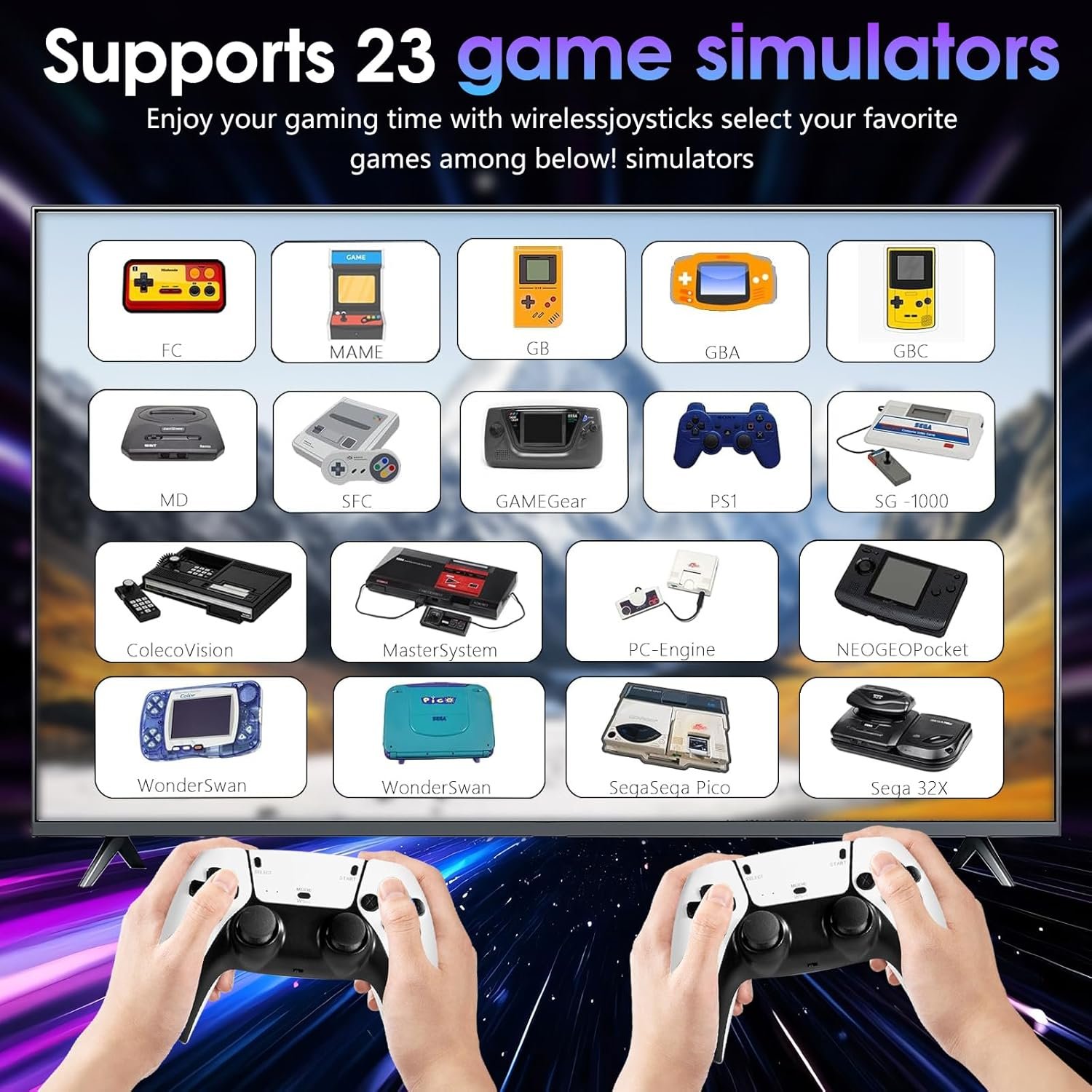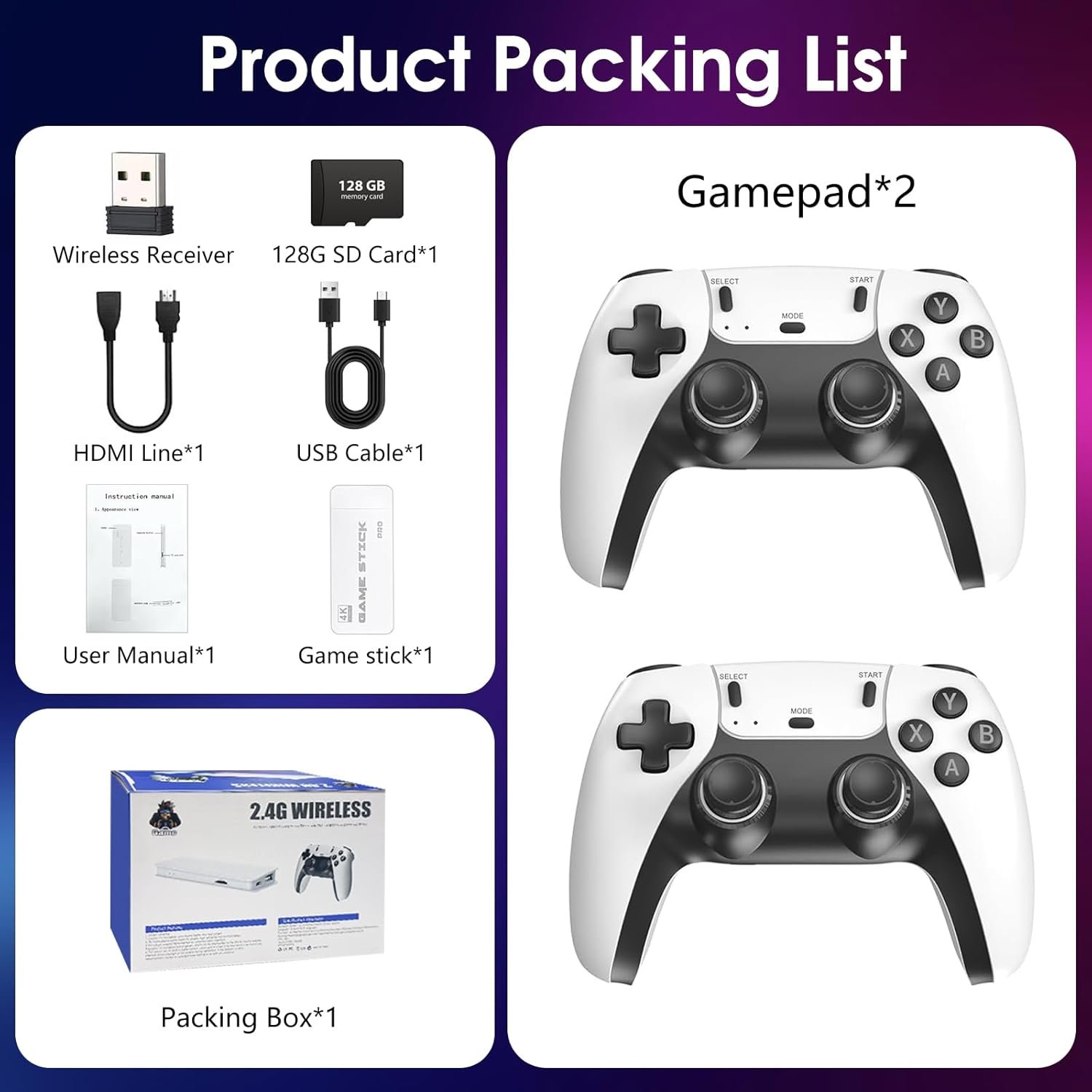 【2.4G Wireless Controllers】The console comes with two 2.4GHz wireless controllers, providing stable, low-latency connection. It supports two-player simultaneous gaming, freeing you from messy cables and offering a responsive and enjoyable gaming experience
