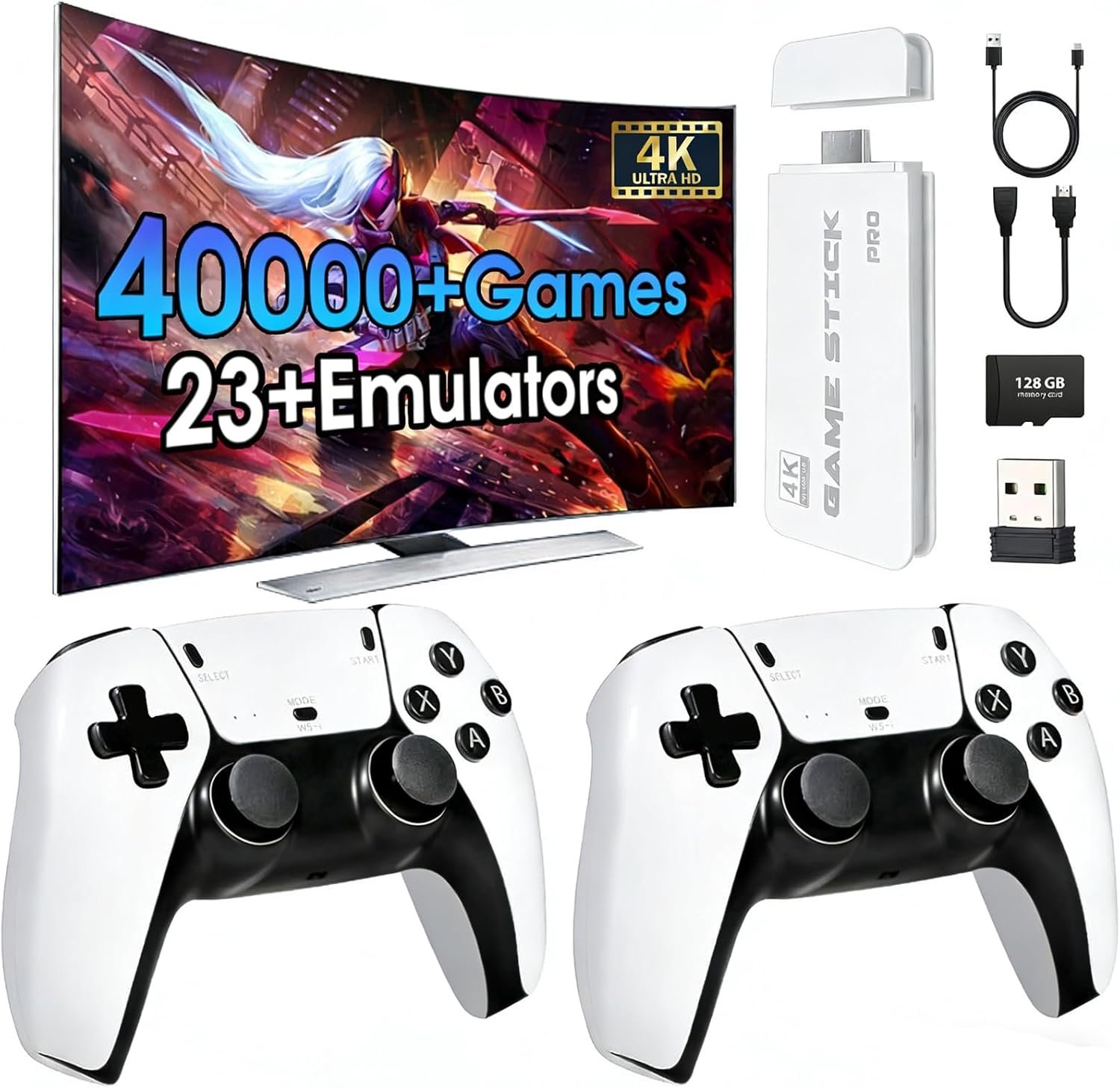 2026 New Wireless Retro Game Console, 23 Emulators and 40000+Games, with Dual 2.4G Wireless Controllers Plug and Play 4K HDMI TV Game Stick (128G) White