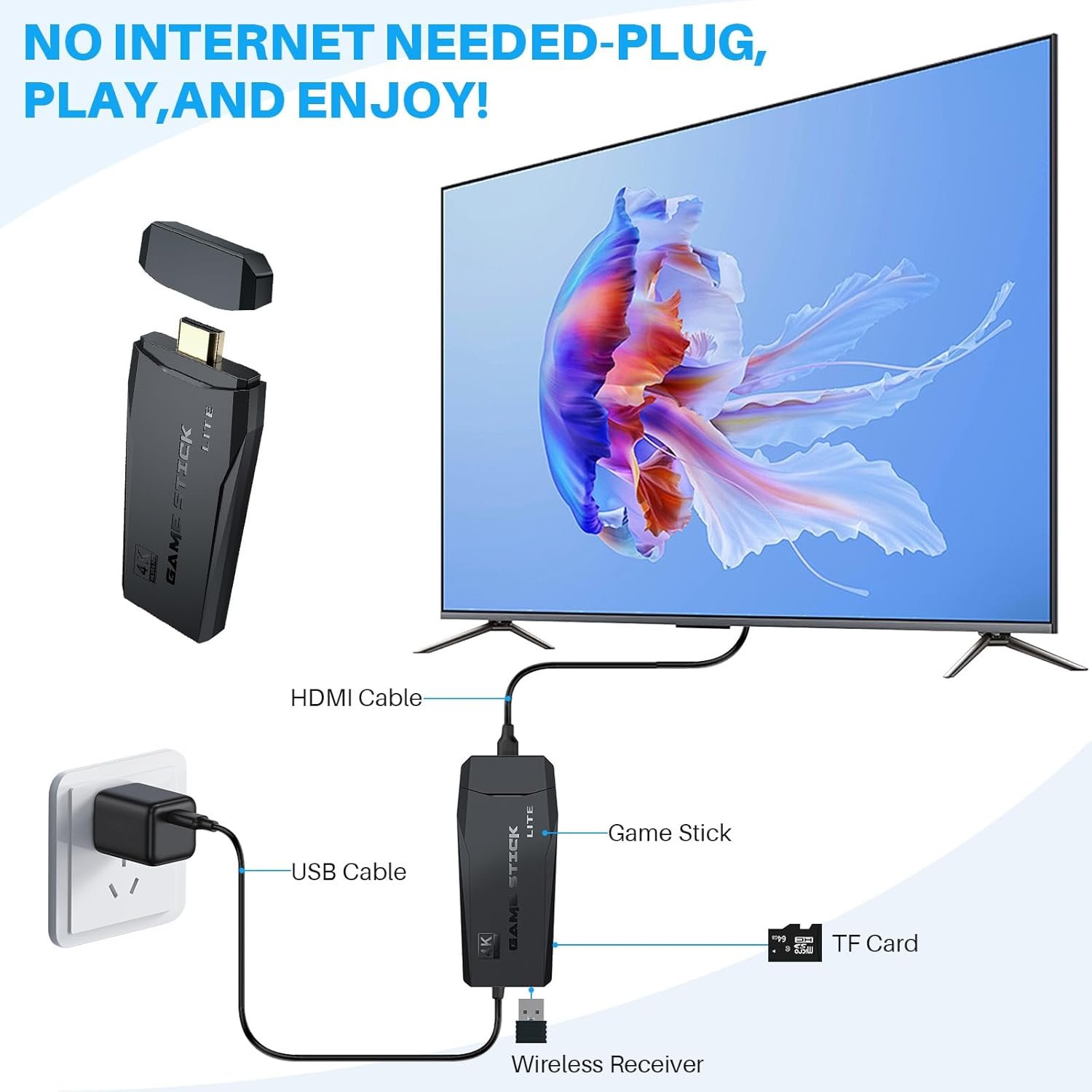 Retro gaming stick for 4K Ultra HD TV/PC/Monitor/Projector, support HDMI connection (not AV output). And comes with 64GB TF card.