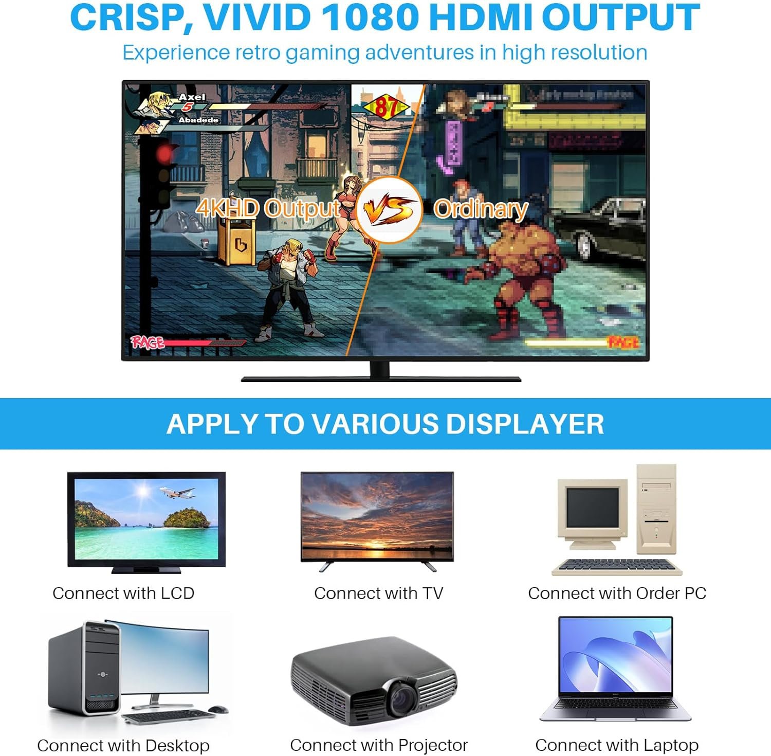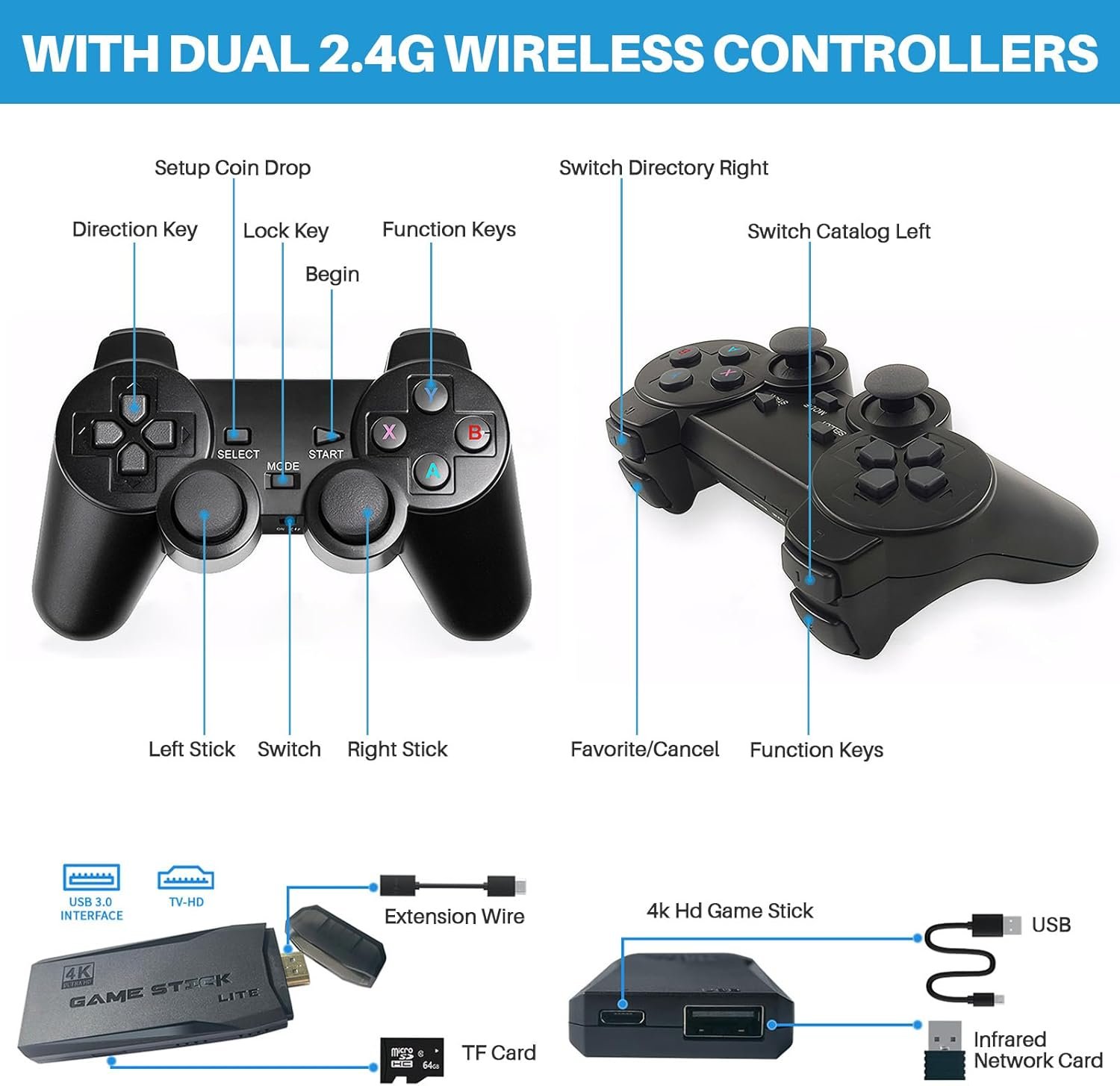 【High-Definition&Plug-and-Play Setup】Experience crystal-clear graphics with 1080p HDMI output,turning your TV into an instant arcade with plug and play video games for tv. The included 64GB TF card ensures ample storage for all your games, while the wireless design eliminates clutter. It’s a user-friendly game stick-style device that requires no downloads or complicated installations—just connect and play!