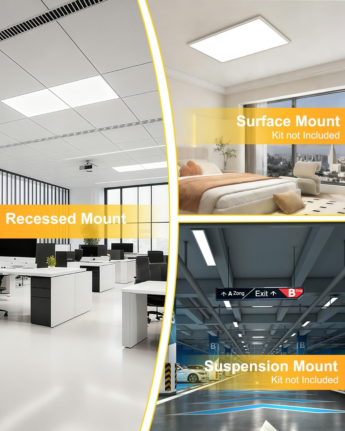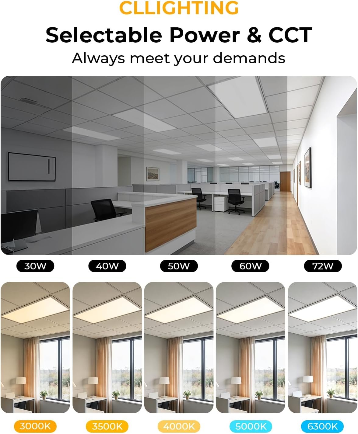 ✅ Field-Selectable CCT & Wattage: 5 wattages (30W/40W/50W/60W/72W) and 5 color temperatures (3000K/3500K/4000K/5000K/6300K) selectable. Simply select your preferred setting during installation. These 2×4 LED flat panel lights allow for quick, one-person recessed installation, without extra tools, offering ultimate flexibility for offices, basements, gyms, and other commercial or residential spaces.