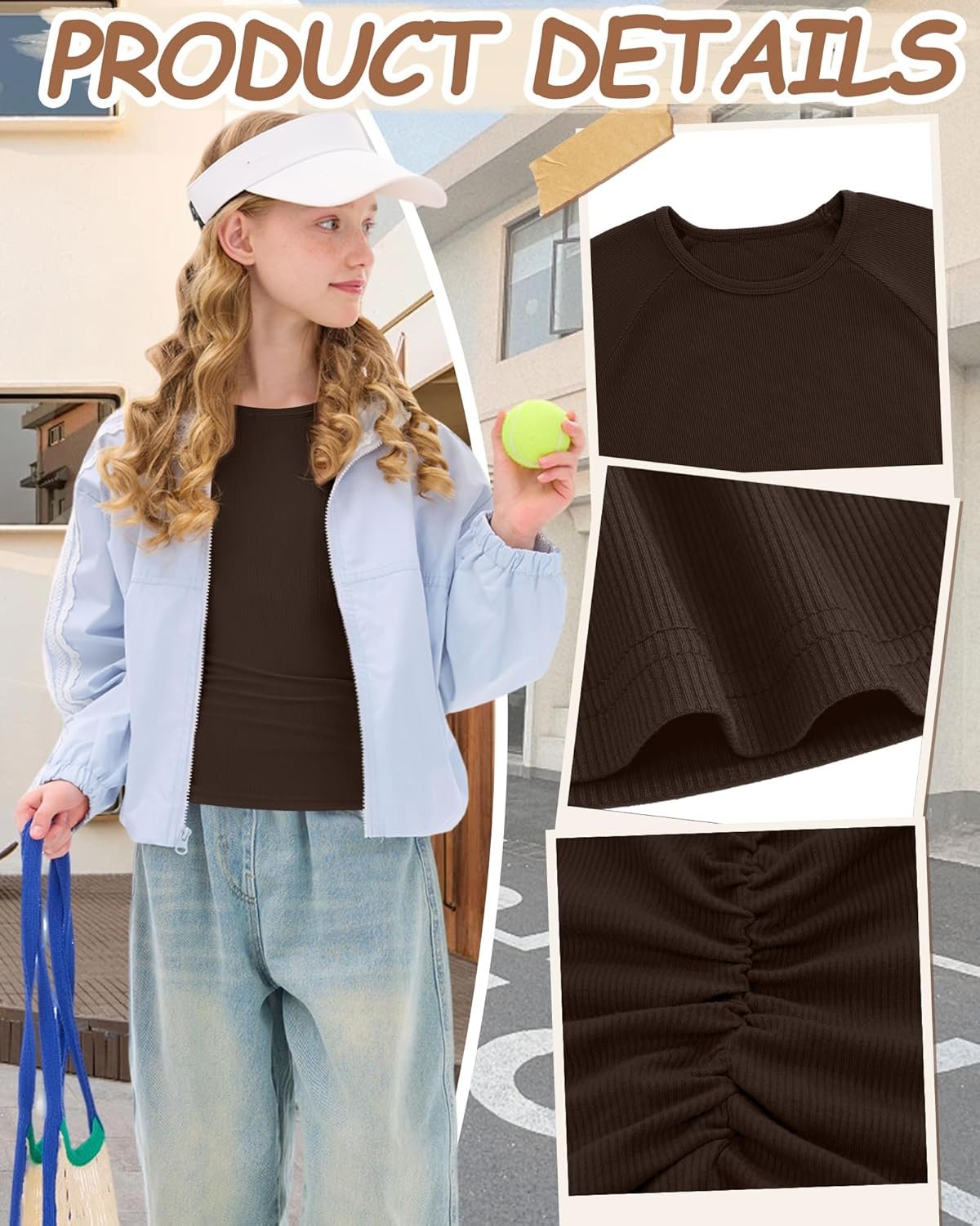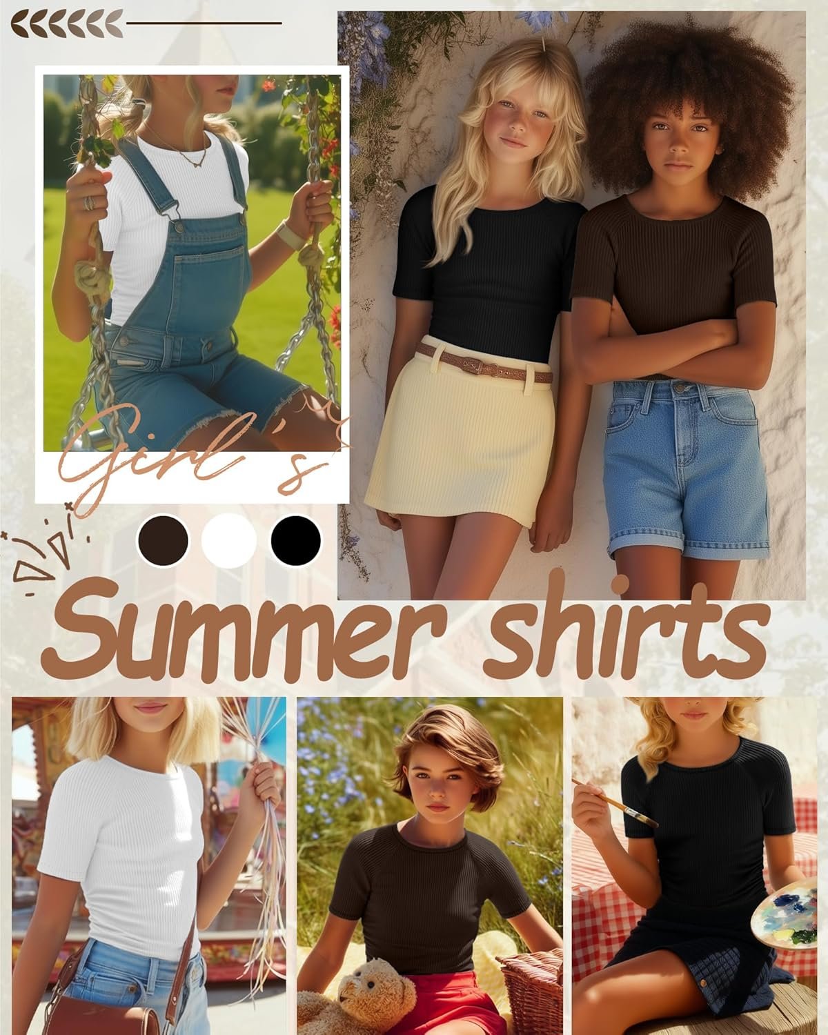 3 Pack Girls Short Sleeve Shirts Summer Slim Fit Crew Neck Tops Ribbed Knit Side Ruched Tees Basic Clothes for Kids