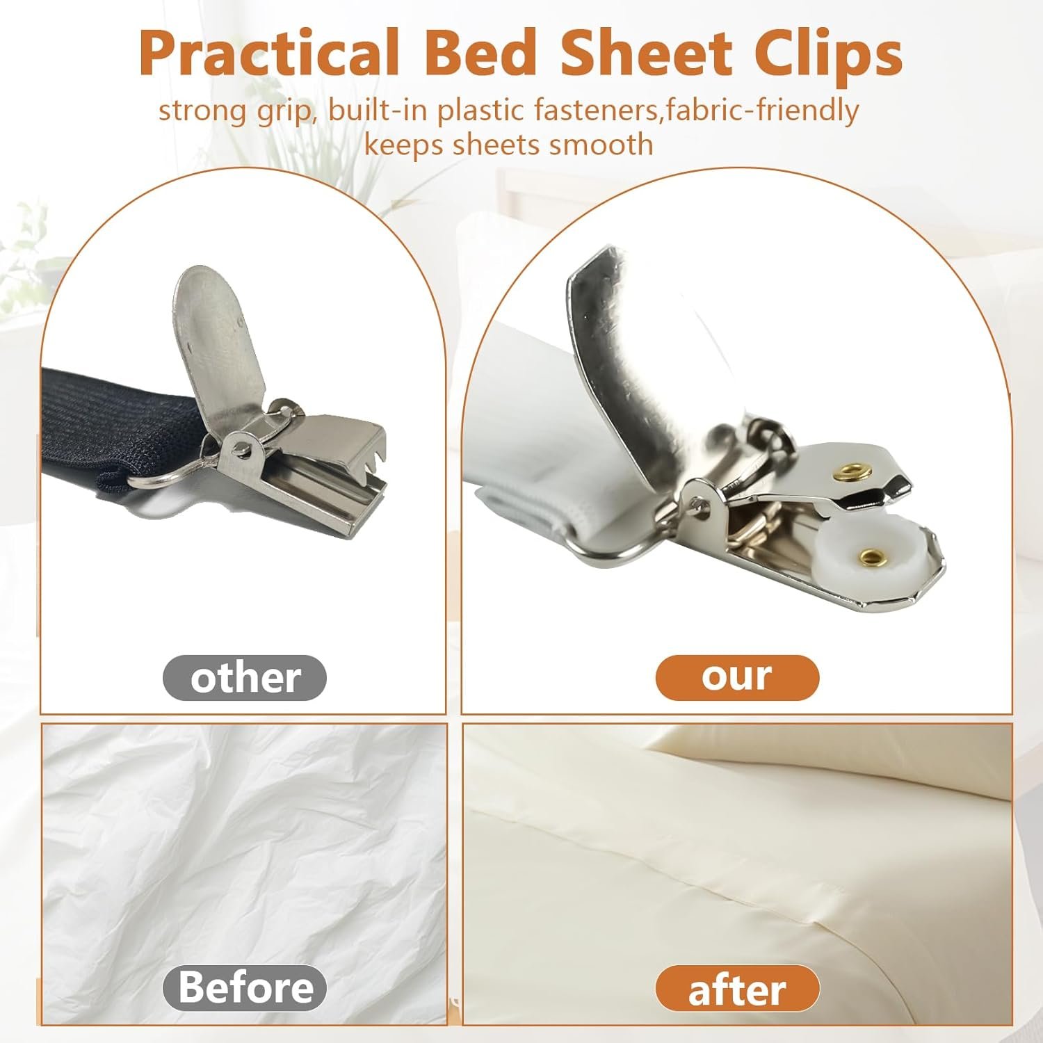 【Wrinkle-Free Corner Sheet Holders】Mattress corner sheet holders keep sheets in place, delivering a taut, hotel-style look. Use these sheet keepers or bed sheet lock for smooth, slip-free bedding.
