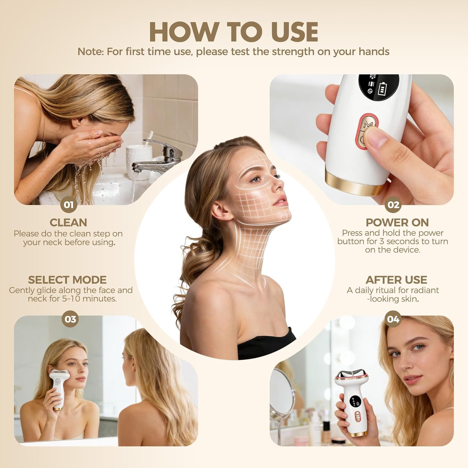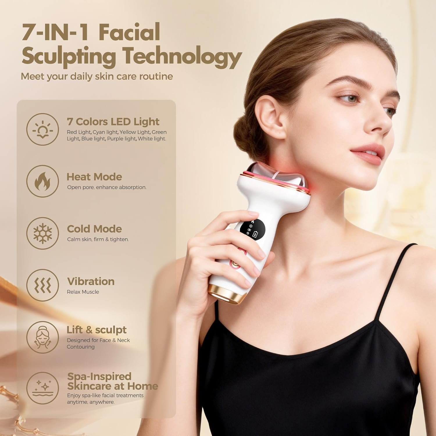 【Multifunctional Facial Massager】This double chin reducer combines multiple functions into one device, specifically targeting various skin problems one by one. Enjoy salon-level skincare at home while saving money. It features 7 precise LED wavelengths, microcurrent lifting, hot and cold therapy, and soothing vibration. The face and neck massagers are activated simply by touching the tips of the metal head to the skin.