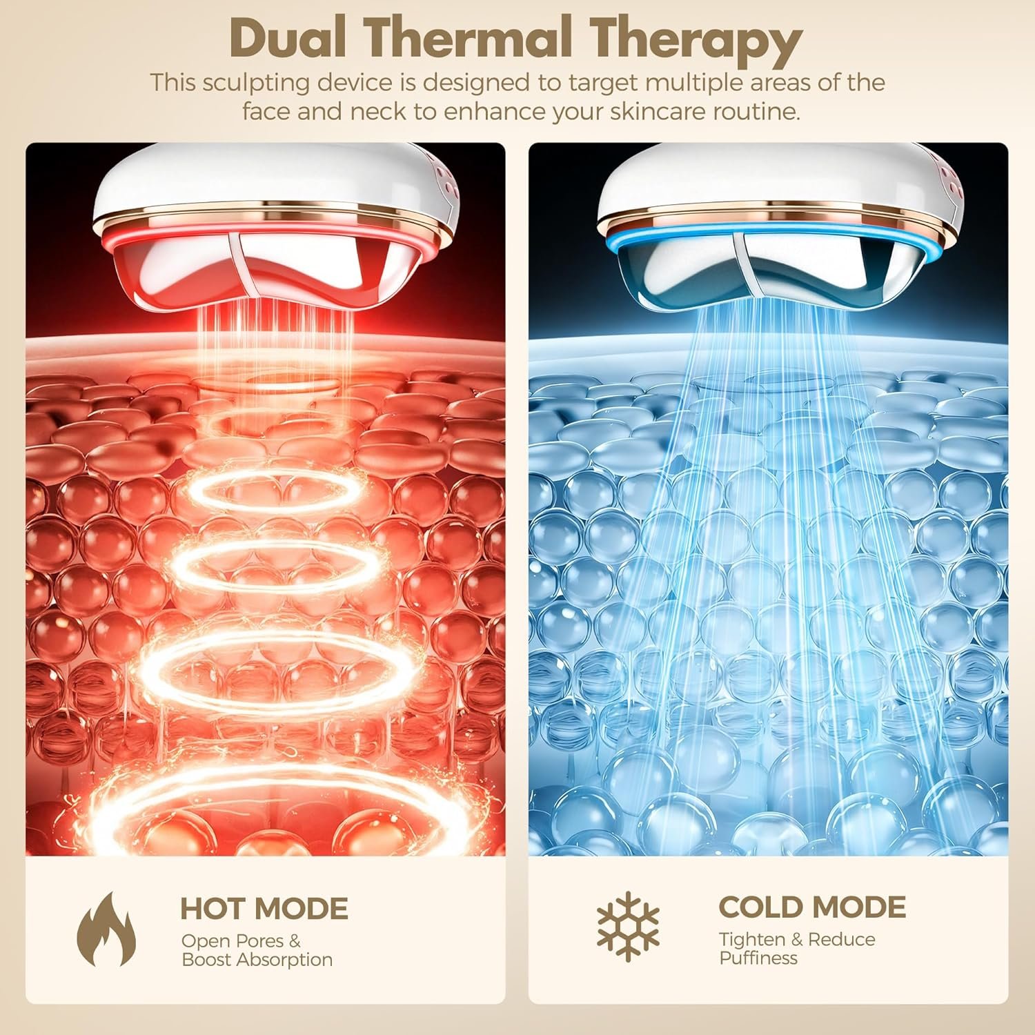 【Dual Hot and Cold Temperature Mode Face Massager Tool】 This face depuffer’s heating mode works with red, yellow, and blue light, while the cooling mode works with green and blue light. You can customize the combination of functions according to your skin condition. For example, hot massage soothes the skin, accelerates essence absorption,promotes circulationand and helps smooth out wrinkles; cold massage shrinks pores, locks in moisture, and calms the skin, reducing redness. Additionally, the cold mode is a great tool for quickly reducing puffiness in the morning.