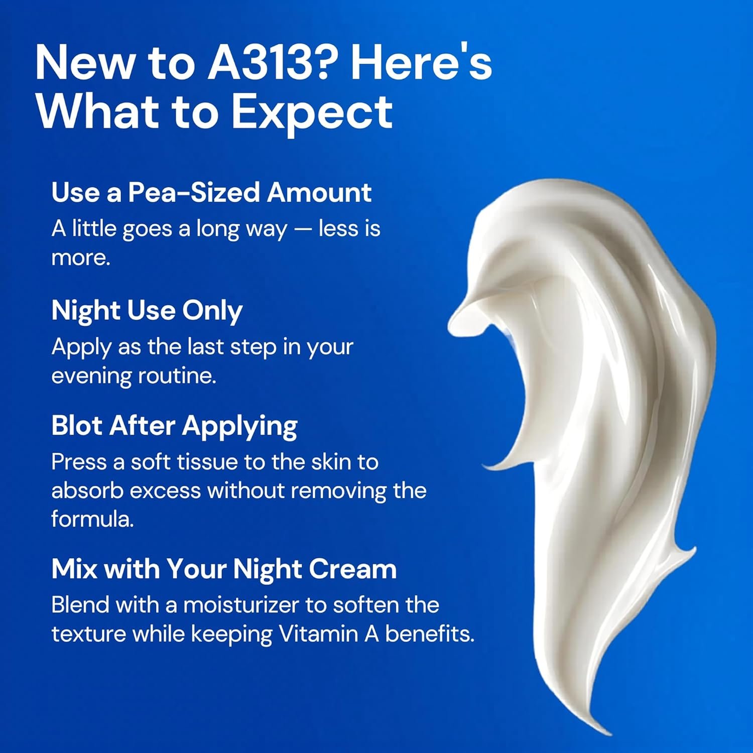 RICH OINTMENT TEXTURE – A313 is a pommade, not a cream. Its thick, occlusive base is what makes it effective as a nighttime Vitamin A treatment. Apply a pea-sized amount and allow to absorb overnight. This texture is by design and a key part of the formula.