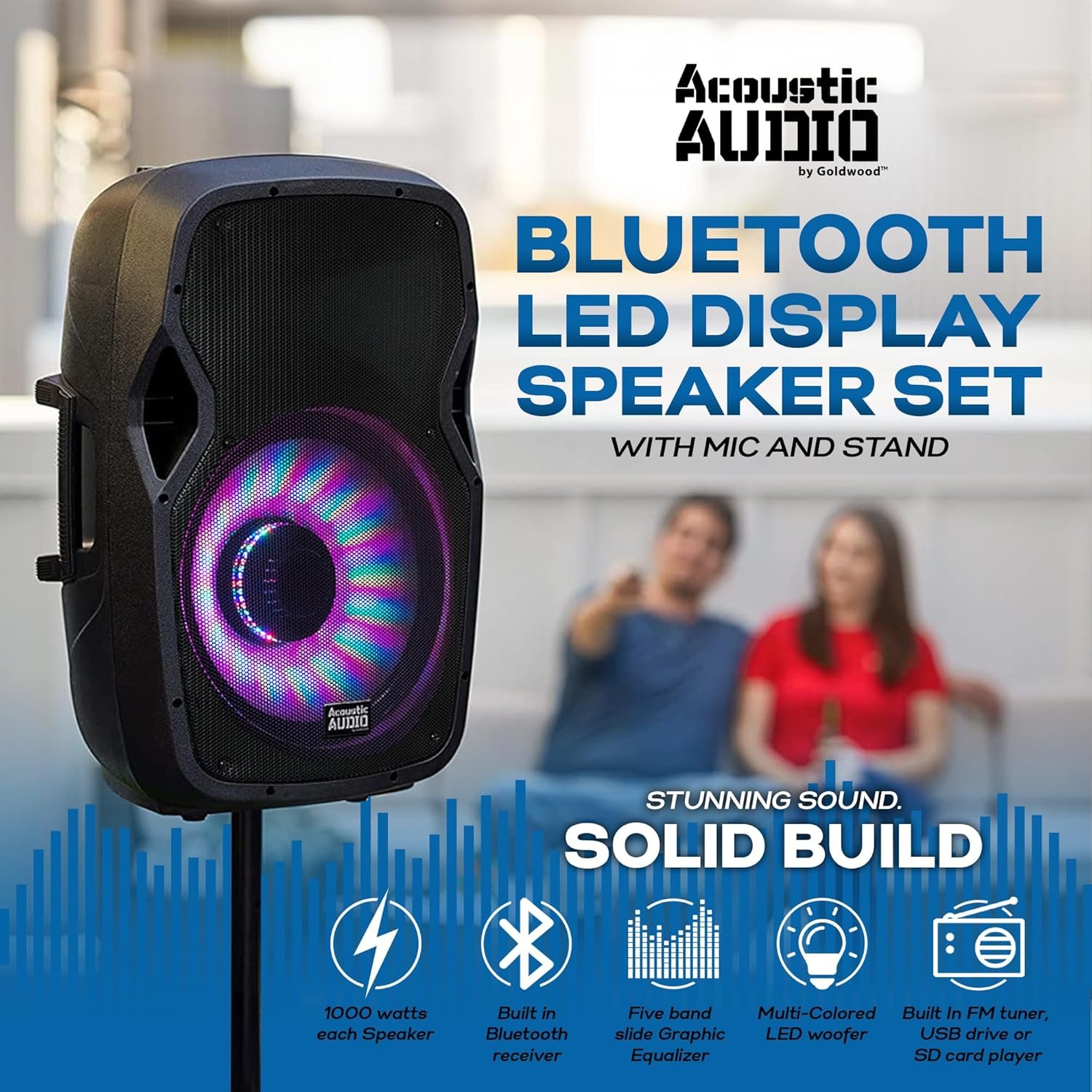 Acoustic Audio by Goldwood 1000W Bluetooth Speaker w/ Flashing LED, Large Plug-In PA System w/ Stand, Mic, & Remote for Karaoke, DJ, or Tailgate Party