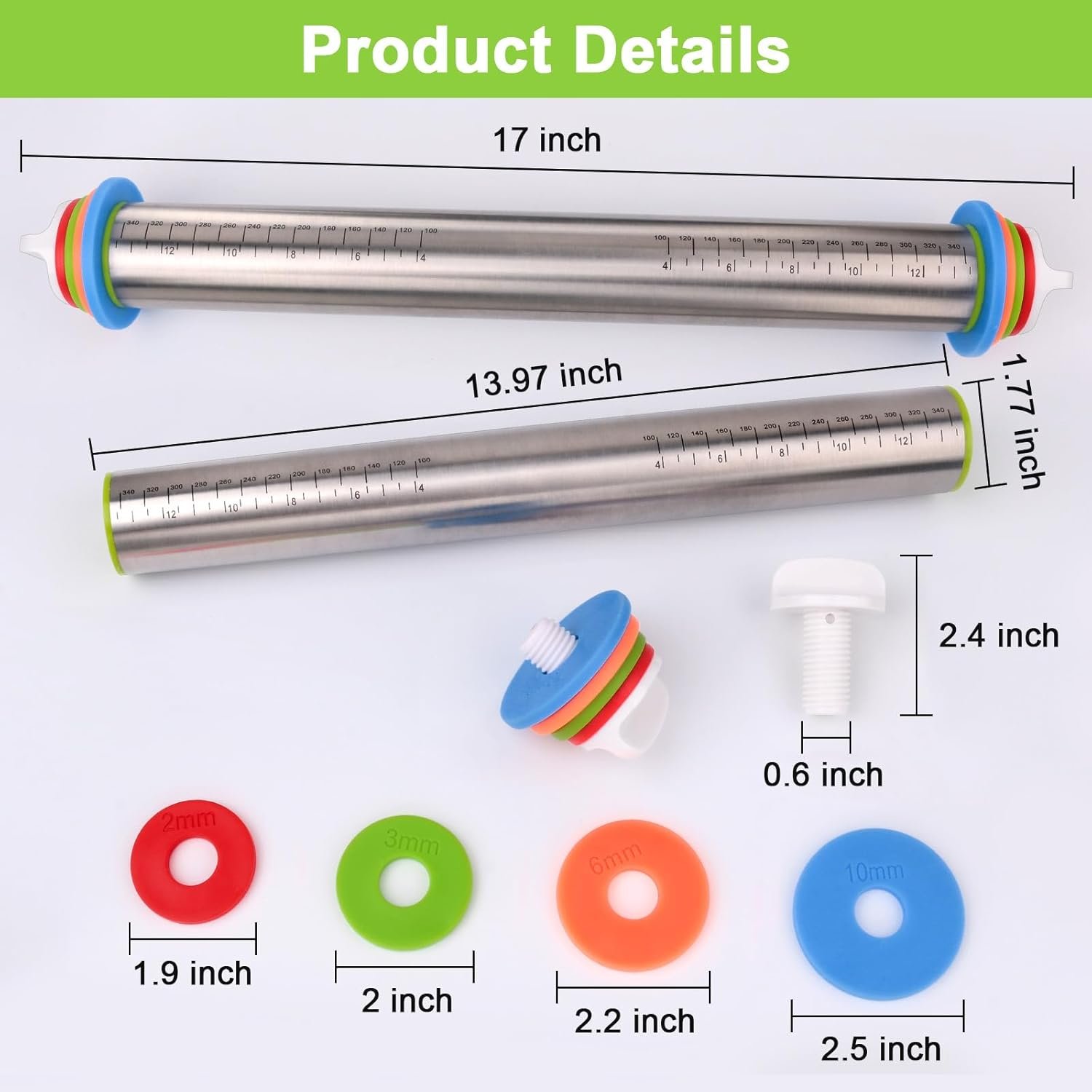 Stainless steel rolling pin with thickness rings: This 17-inch rolling pin is made from high quality stainless steel for superior durability and longevity. It resists rust far better than ordinary aluminium rolling pins, embossed rolling pin or tortilla roller. The sturdy and robust construction ensures it will last a long time even with frequent use. Compared to traditional dough roller such as a rolling pin and mat or silicone rolling pin, this rolling pin for dough will add durability to your baking needs.