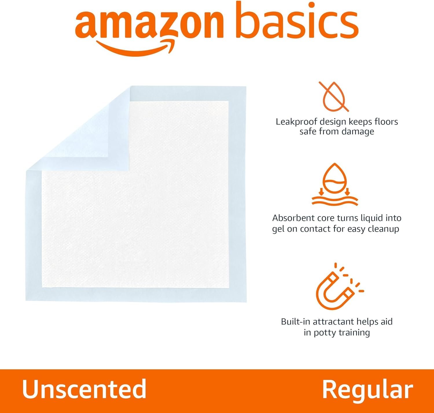 Amazon Basics Leak-Proof Dog and Puppy Potty Training Pee Pads with Quick-Dry 5-Layer Super Absorbent Design for Housebreaking, Regular Size 22×22″, Blue & White, 150 Count