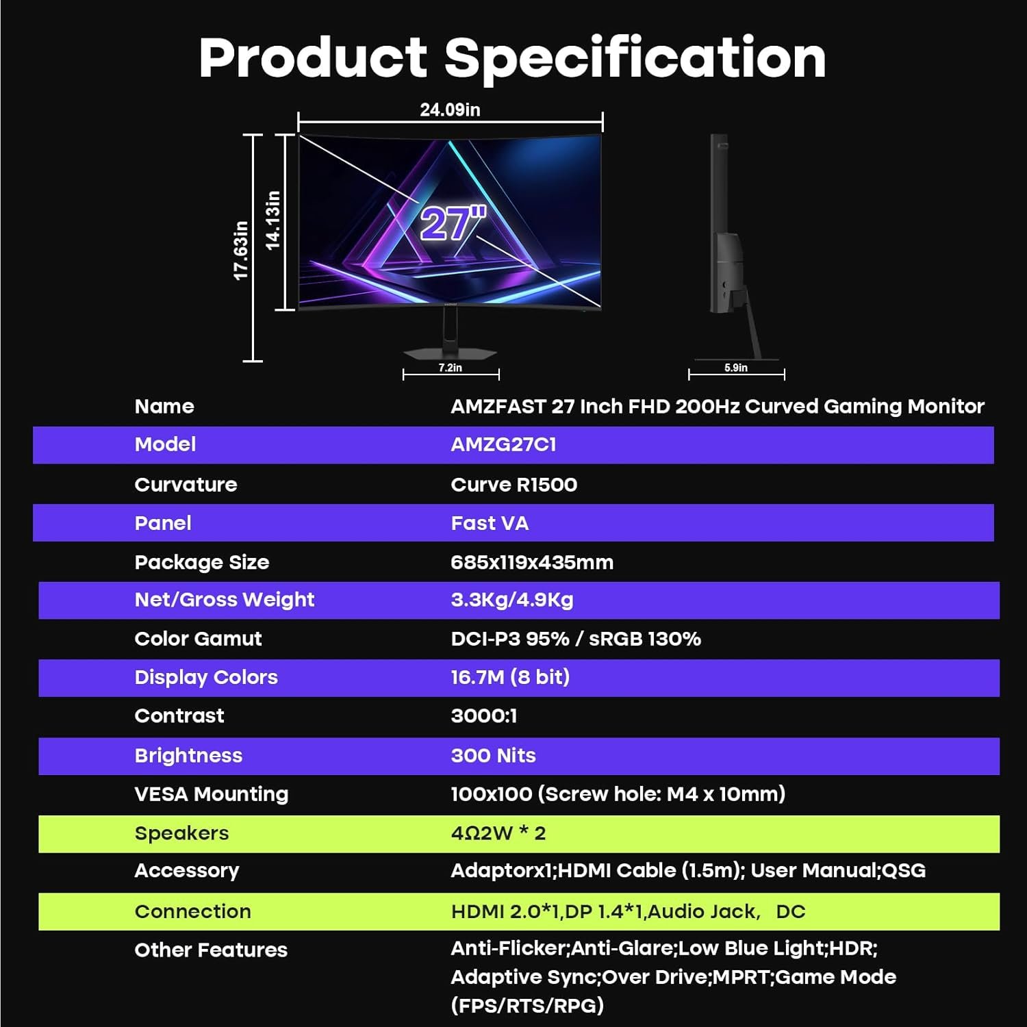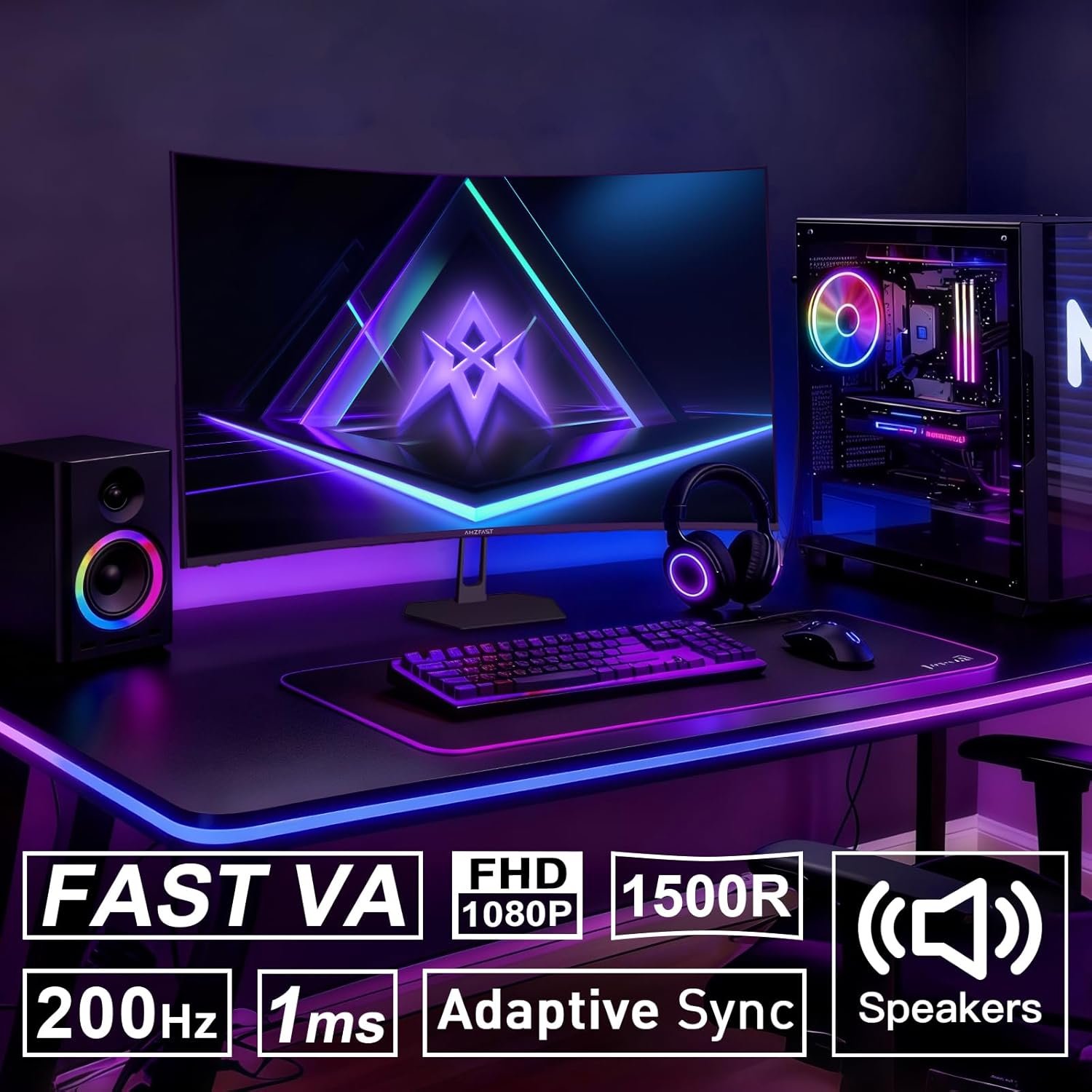 Amzfast 27 inch 200Hz Curved Gaming Monitor, FHD 1080P Computer Monitor with Built-in Speakers, MPRT 1ms with Fast VA Panel | 130% sRGB, 3000:1,1500R | 12 Months Warranty Exchange