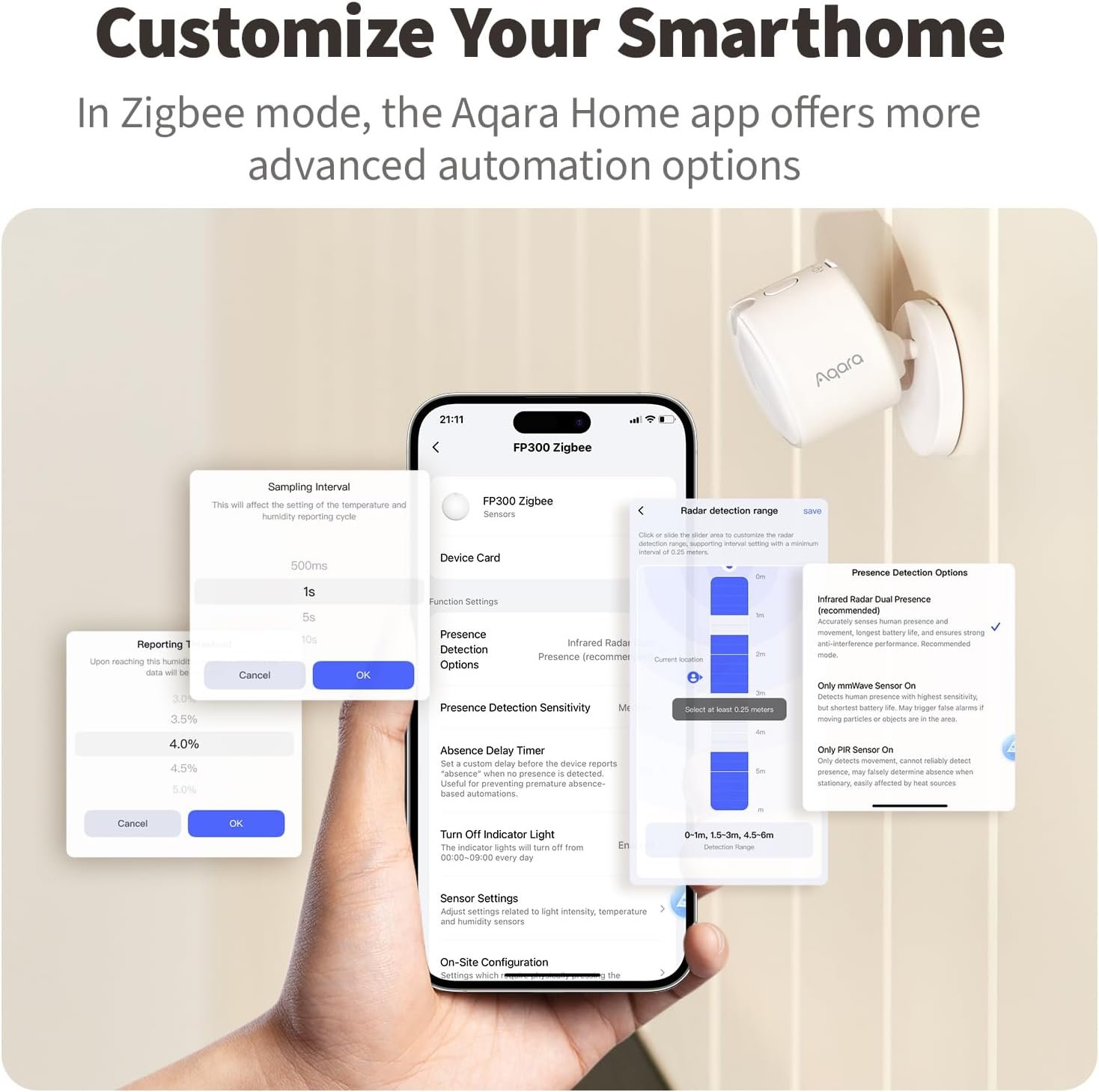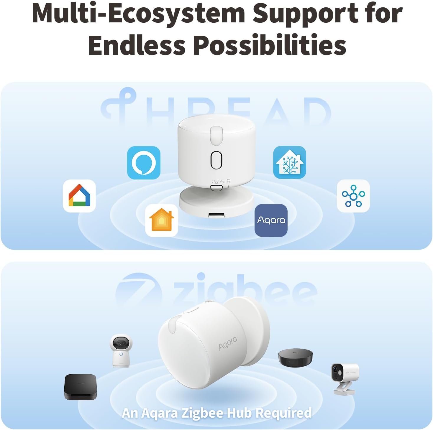 [Broad Compatibility] Supports Matter over Thread and Zigbee for seamless integration with major ecosystems. Works with Apple Home, Home Assistant, Alexa, Google Home, SmartThings, and Homey via Matter for flexible, reliable automation. (* For third-party Matter ecosystems, a corresponding Thread Border Router and Matter Controller are required. * For Aqara, a Zigbee 3.0 or Matter hub like M2/M3/G410/etc, except G2H, with the latest firmware is needed.)