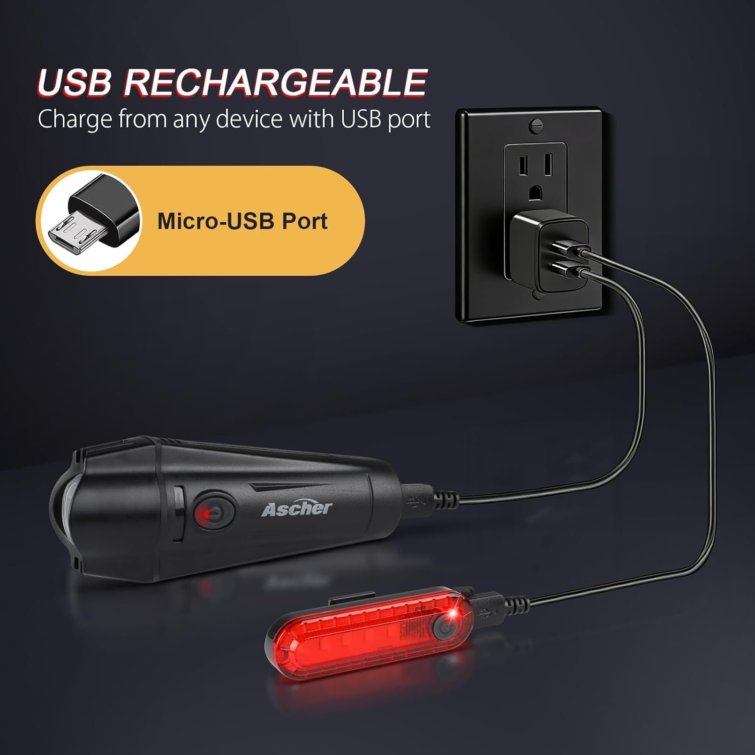 Ascher Ultra Bright USB Rechargeable Bike Light Set, Powerful Bicycle Front Headlight and Back Taillight