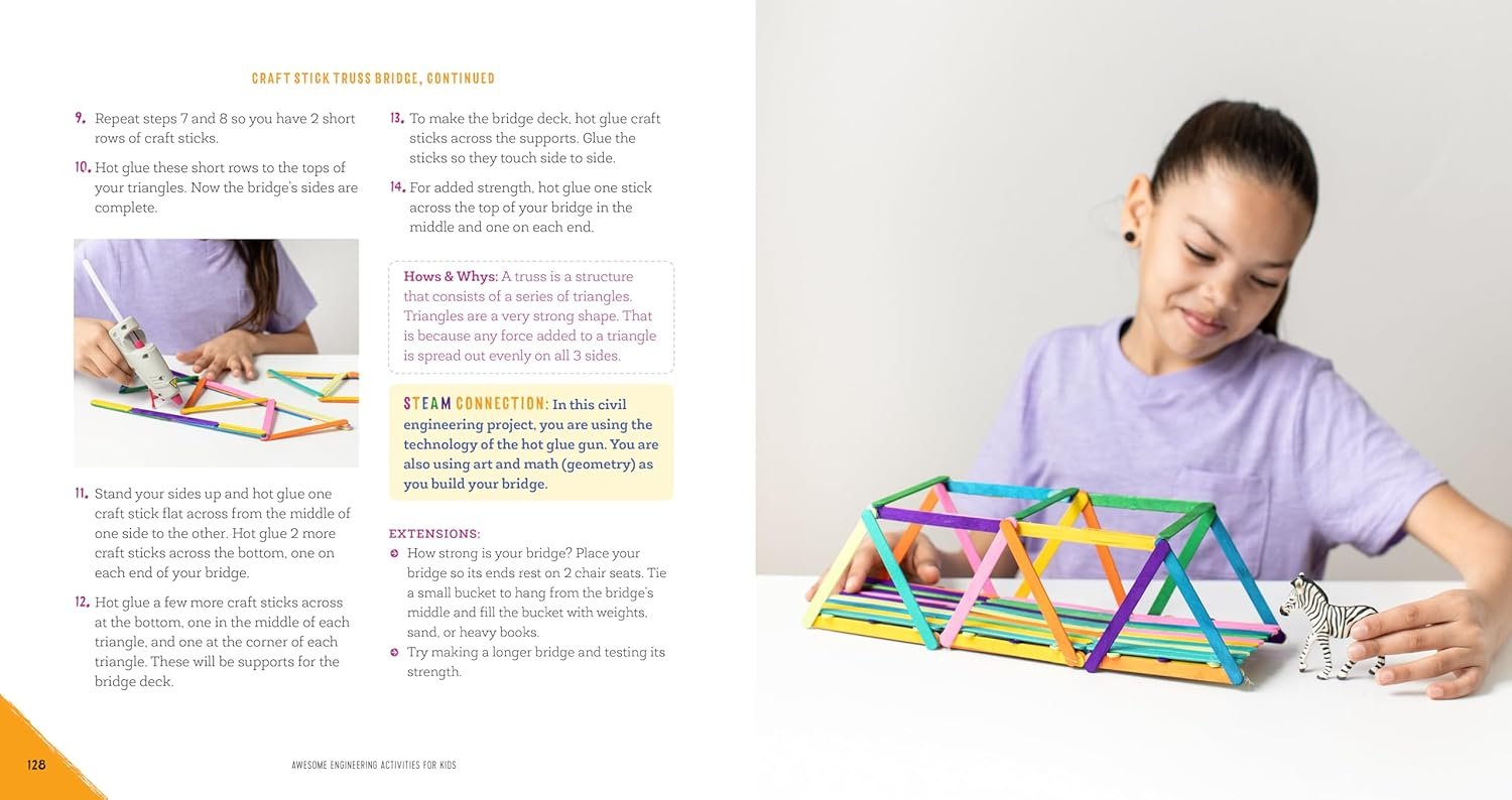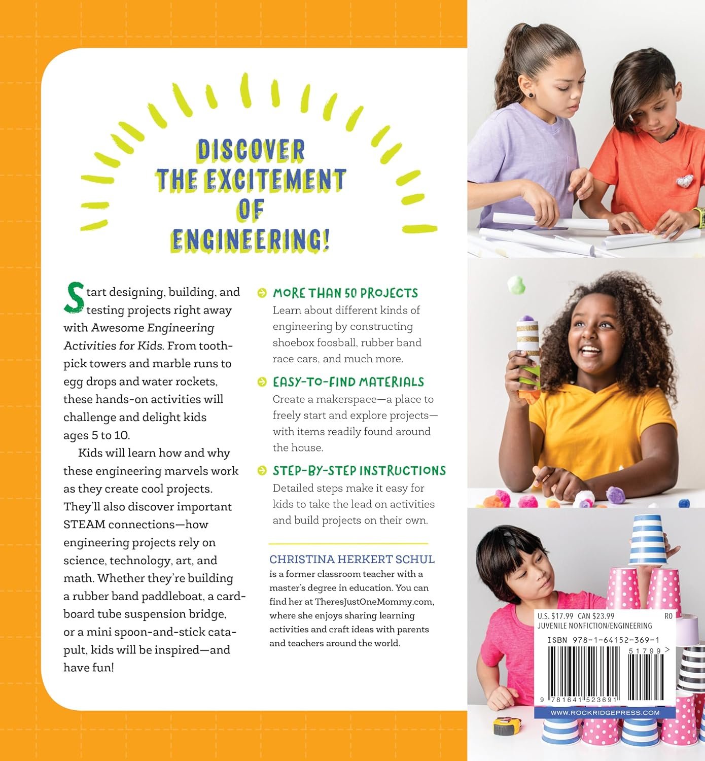Activities kids can do themselves―Make engineering for kids easy and fun with projects like toothpick towers and paper cup phones that use common, inexpensive household materials so they can play and learn anytime.The power of STEAM―Lessons are based in Science, Technology, Engineering, Art, and Math to show kids how these things are everywhere, and help them become better problem solvers and logical thinkers.The basics of engineering―Kids will learn all about engineering with a brief guide to the different types of engineers, an explanation of what they do, and what kids need to know to become one.