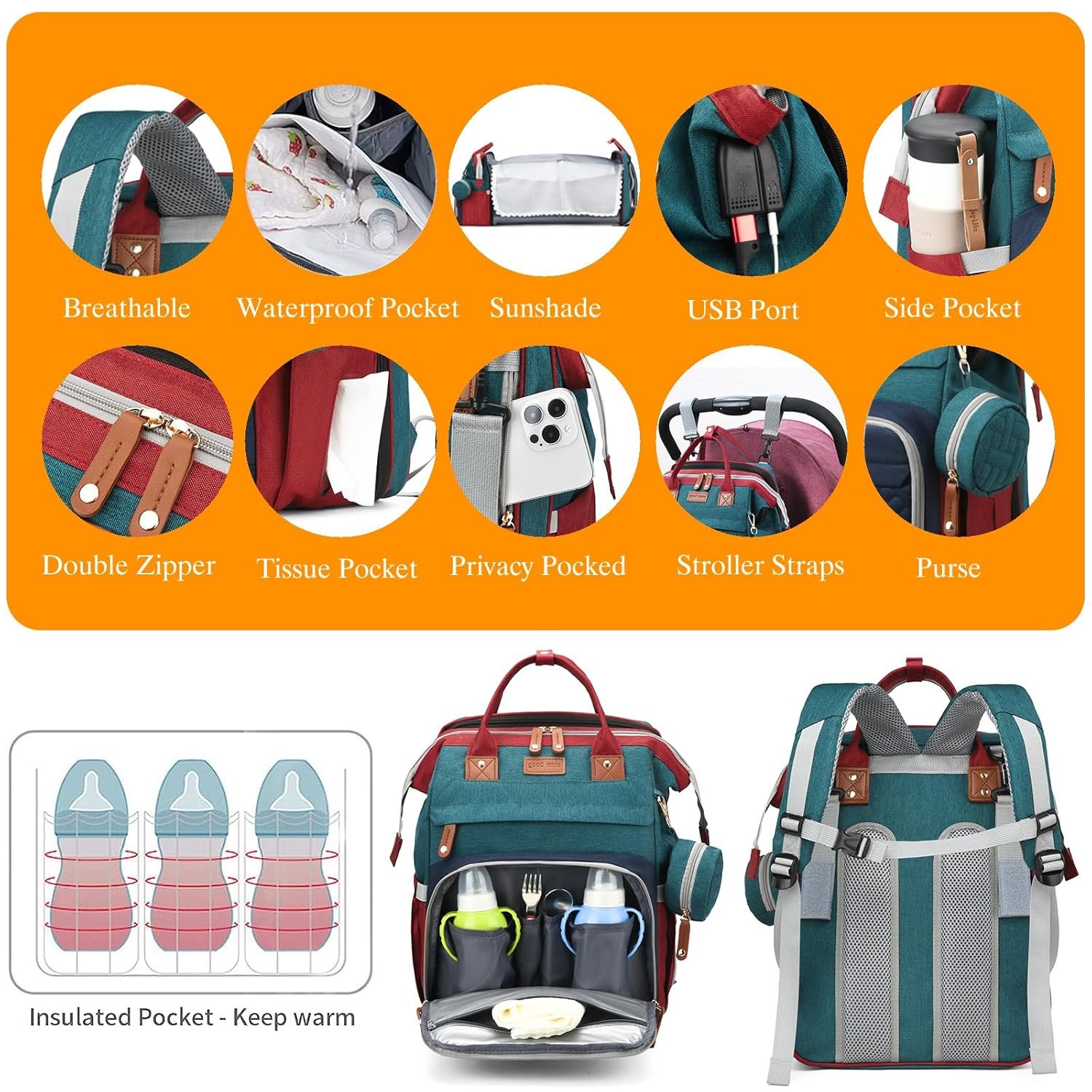 【Convenient Diaper Bag with Changing Station】 All-in-one design includes a diaper backpack, a changing station, a washable changing pad, a pacifier case, a shading cloth and built-in stroller straps. The water-resistant outer fabric and lining make for the clean and mess-free organization for all necessities.