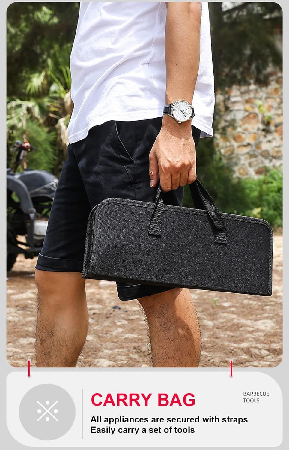 Professional Grilling accessories : In a sturdy carrying bag, you’ll find a chef’s spatula, grill tongs, a grill fork. This Grill Utensils Set is ideal for use at home or while traveling.