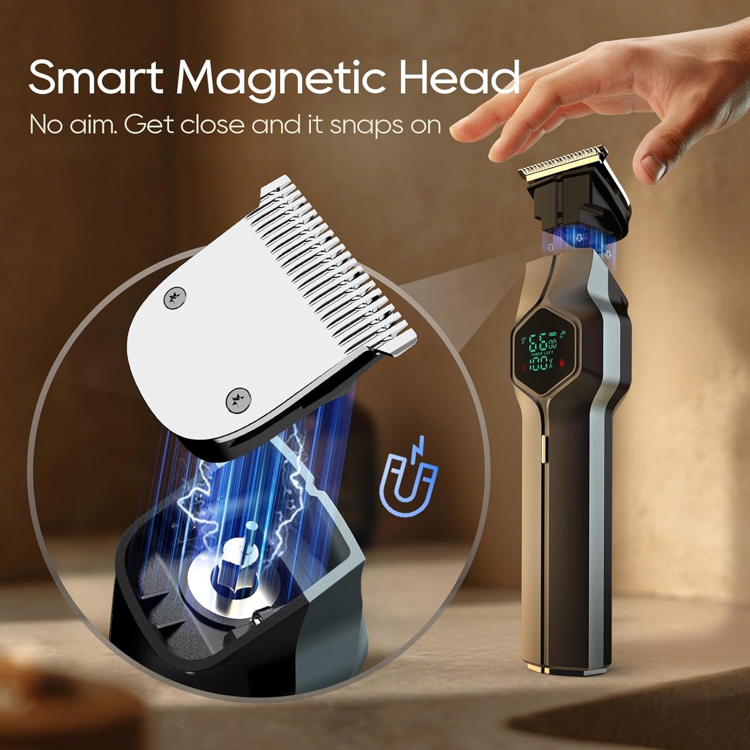 Steady Click — Ready to Trim Instantly. The All-Magnetic Snap-on Heads connect with smooth, effortless precision — no pressure, no guess, just a confident fit that feels right every time. A quick switch that keeps you ready for any detail — from beard to body, from morning to night