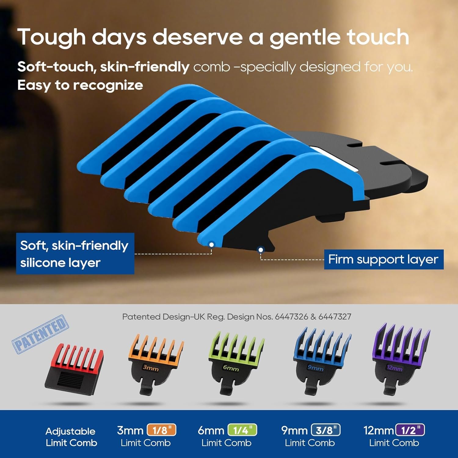Color-Coded Comb — Find Lengths at a Glance. The soft, skin-friendly comb glides smoothly across your skin for a gentle, irritation-free trim. Each color represents a specific length, helping you switch guards quickly and confidently. Perfect for efficiently styling your hair and beard with precision and ease