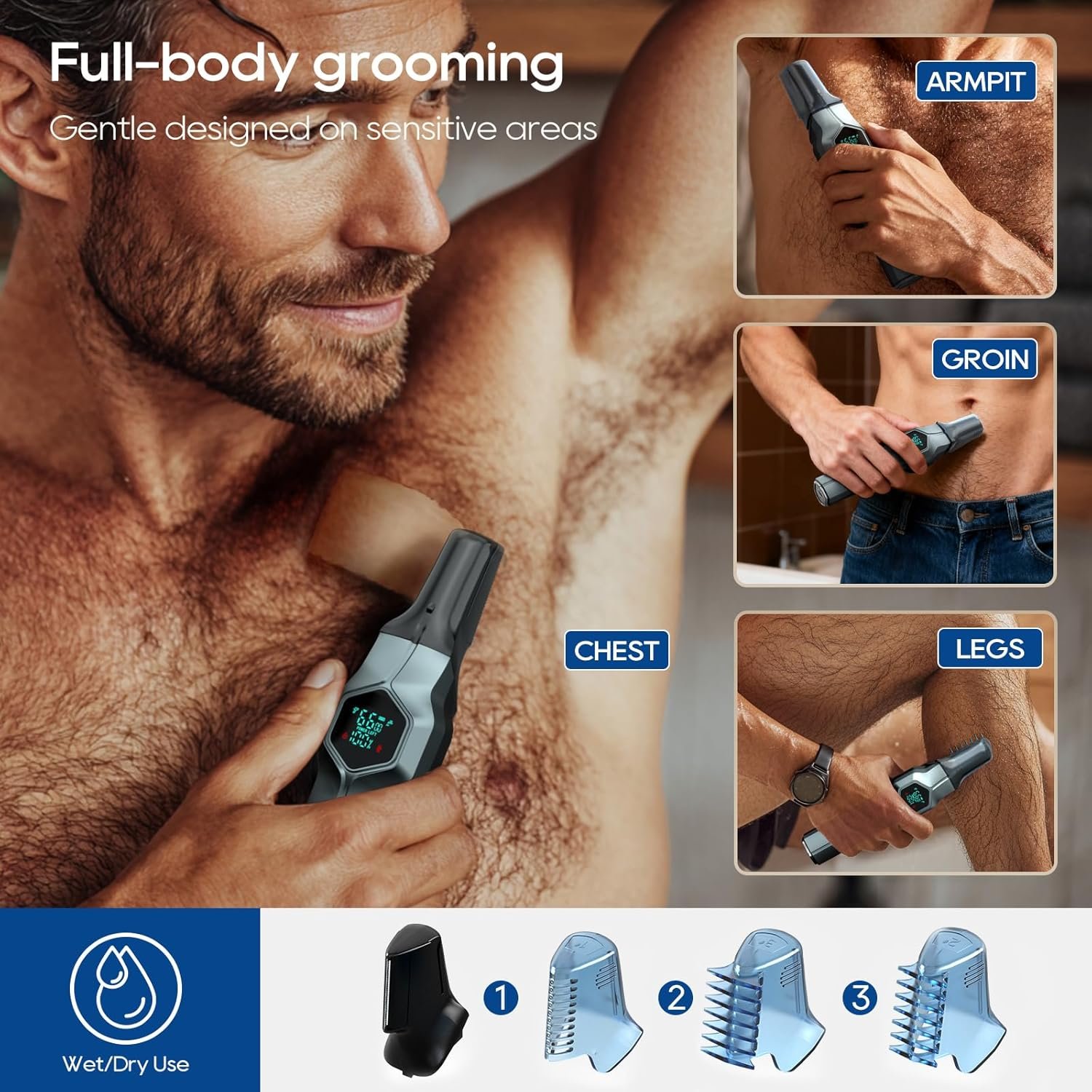 Expert Grooming — Gentle on Sensitive Skin. The I-shaped handle ensures a secure, non-slip grip—giving you full-body control without slipping. The V-shaped blade glides gently across sensitive zones, while three precision comb attachments let you choose lengths simply and precisely—perfect for groin, chest, armpits, legs, and all body hair