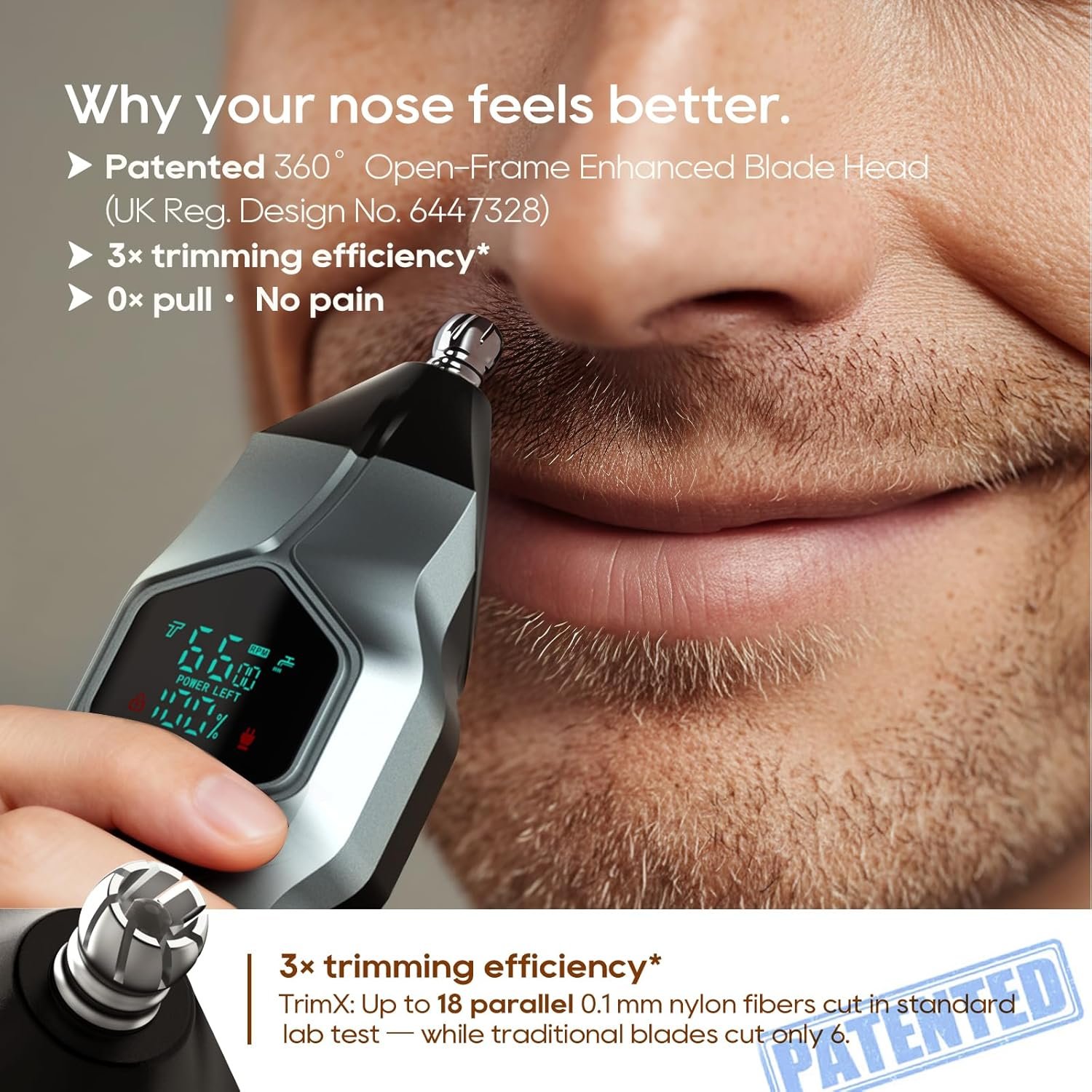 Precision Trim — Nose Feels Comfortable. Patented 360° Open-Frame Blade Head trims from every angle — no pulls, no pain. In lab tests, TrimX cut up to 18 parallel 0.1 mm fibers, while traditional blades cut only six — delivering 3× trimming efficiency with the same gentle comfort