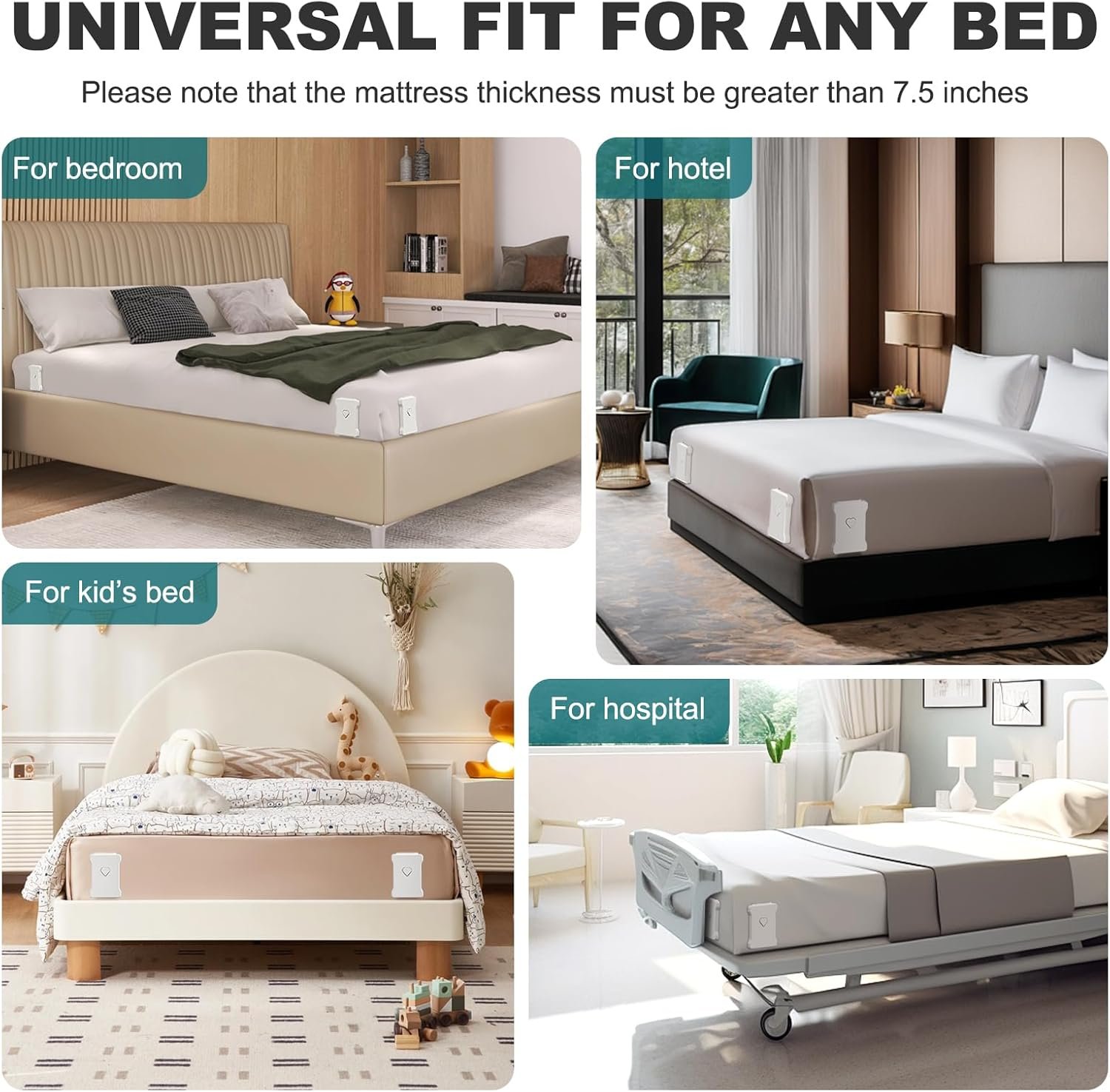 ๐ผ๐๐๐๐๐๐๐๐ ๐ญ๐๐ ๐ญ๐๐ ๐จ๐๐ ๐ด๐๐๐๐๐๐๐ ๐ป๐๐๐๐:Our bed sheet holders are designed to fit all mattress sizes, including Twin, Full, Queen, and King. The open-corner design works with any fitted sheet, including extra-deep pockets (up to 22 inches). Whether you’re using memory foam, pillow-top, or hybrid mattresses, these holders ensure a snug, wrinkle-free fit, providing complete versatility.
