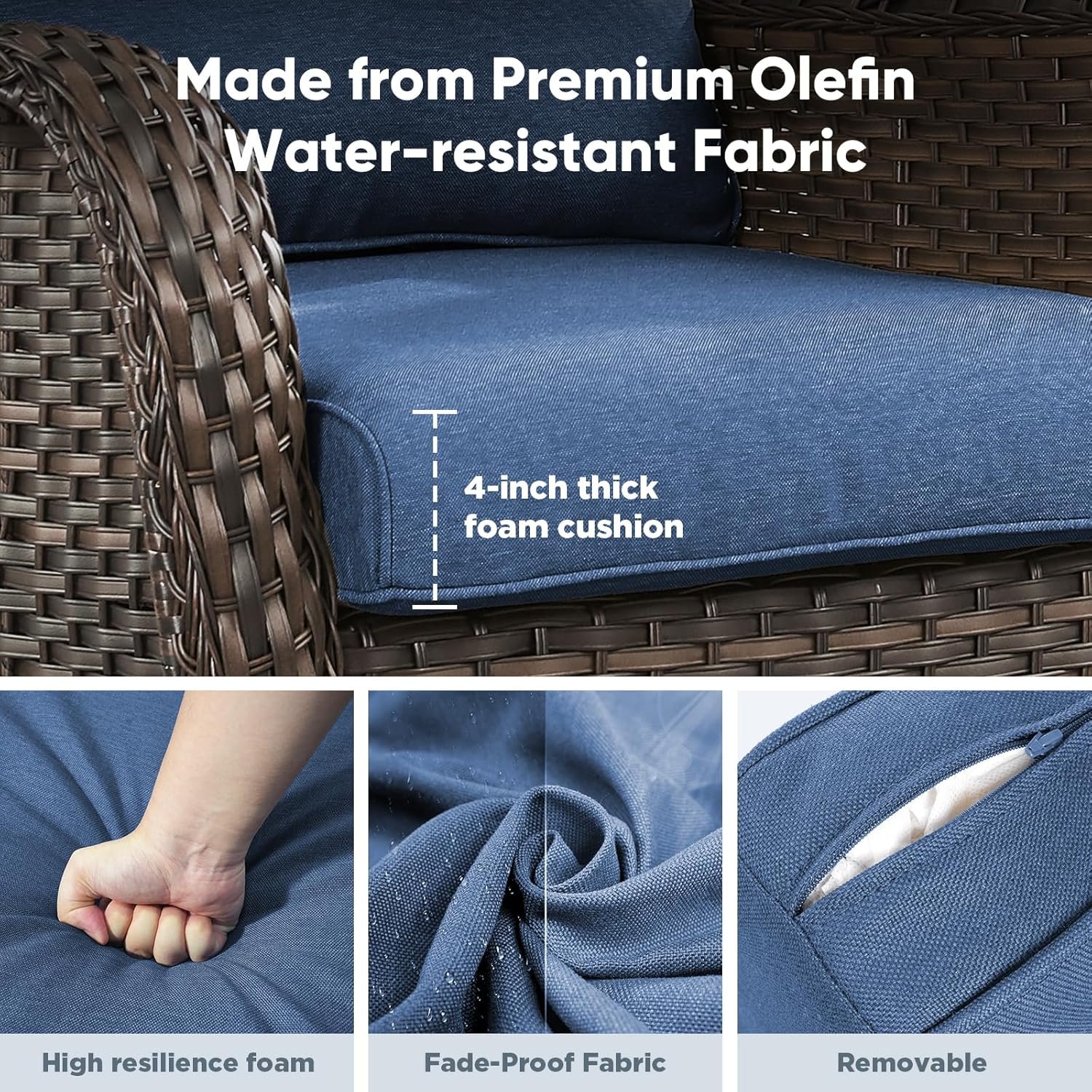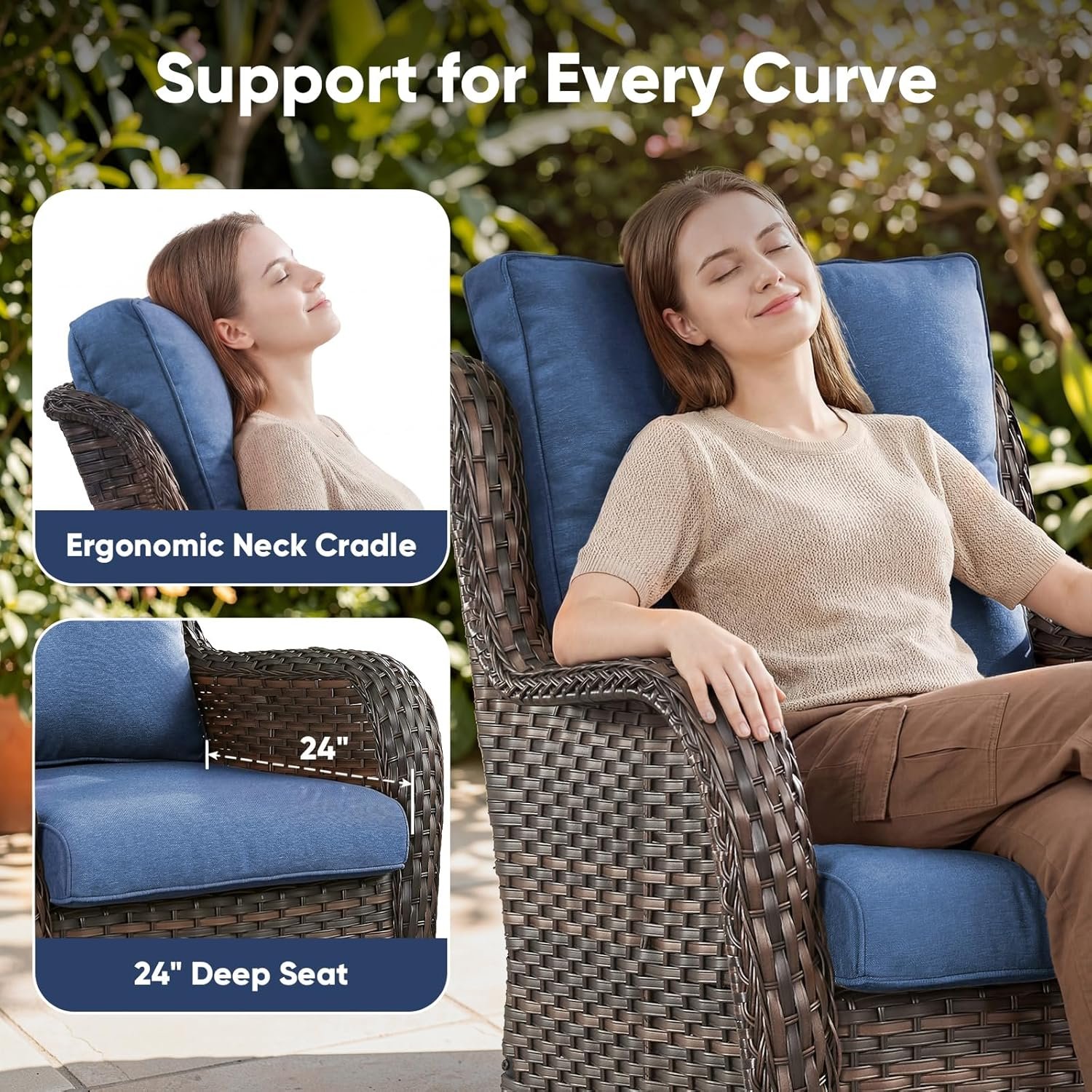Ergonomic Support & Long-Lasting Comfort: Sink into the embraced feeling of our wicker patio chairs. The 22″ high back and 24″ deep seat cradle your body, while the 28D high-resilience foam cushions (with 30% better bounce-back) are engineered to resist sagging for years.