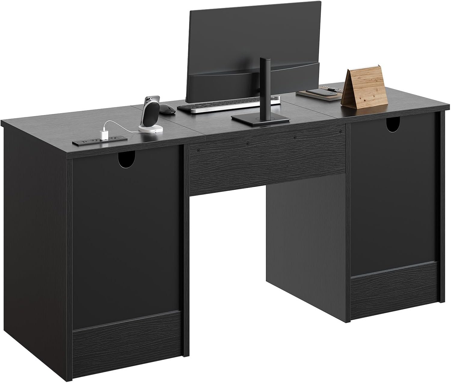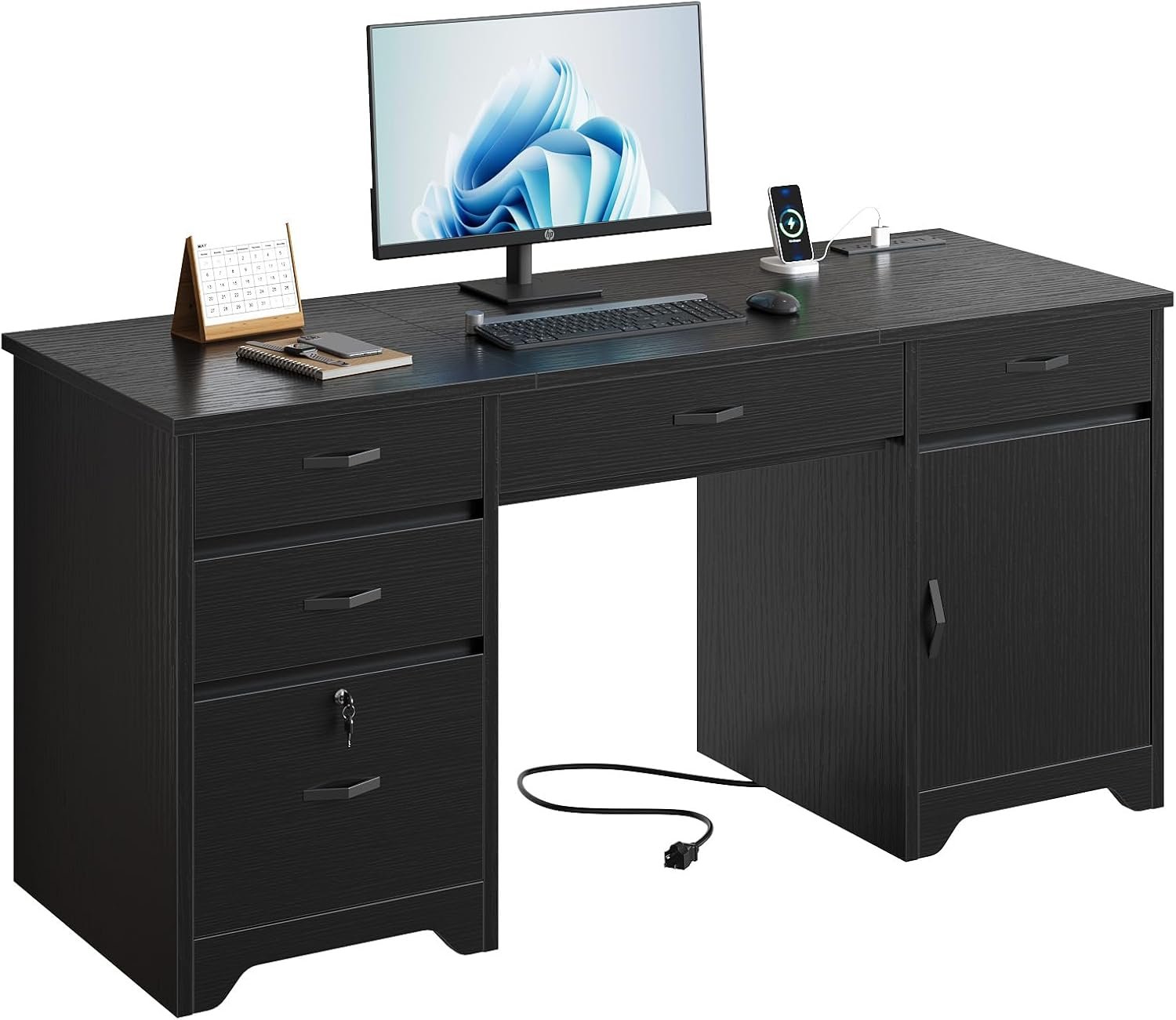 Bestier 59” Office Desk with Lockable Drawers, Modern Computer Desk with File Drawer, Charging Station & Drop-Front Keyboard Drawer, Executive Desk with Storage Cabinet for Home Office & Studio, Black