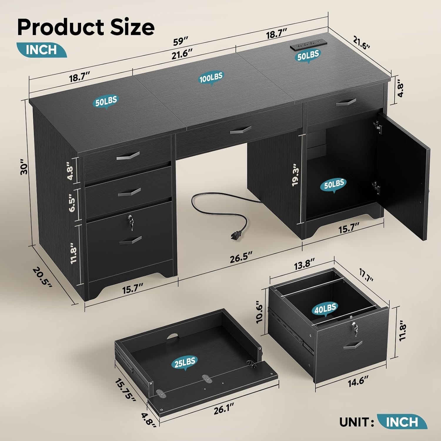 Robust & Durable: Built with sturdy dual pedestals, the desk supports up to 200 lbs on top, 20 lbs in each drawer, and 40 lbs in the file drawer—ideal for monitors, printers, and more