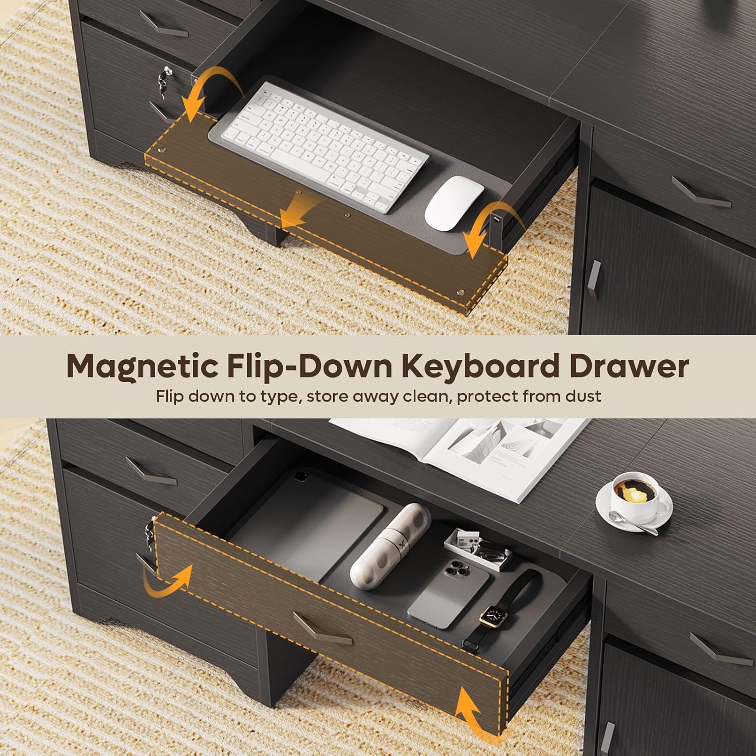 Secure & Functional: A deeper drop-front keyboard drawer (upgraded, 4″/10cm deeper than previous version) doubles as extra storage or an ergonomic tray, providing more spacious operation. The lockable file drawer includes adjustable rails for letter, A4, or legal folders—keeping sensitive documents safe and organized