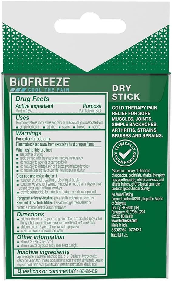 Introducing the NEW Biofreeze Dry Stick! This convenient, portable dry stick has a non-greasy formula and goes on dry & clear. The mess-free format provides the pain relief you need without the hassle. Our fast acting, long lasting, cooling menthol formulation delivers powerful penetrating pain relief for sore muscles and joints, simple backaches, arthritis, strains, bruises and sprains.
