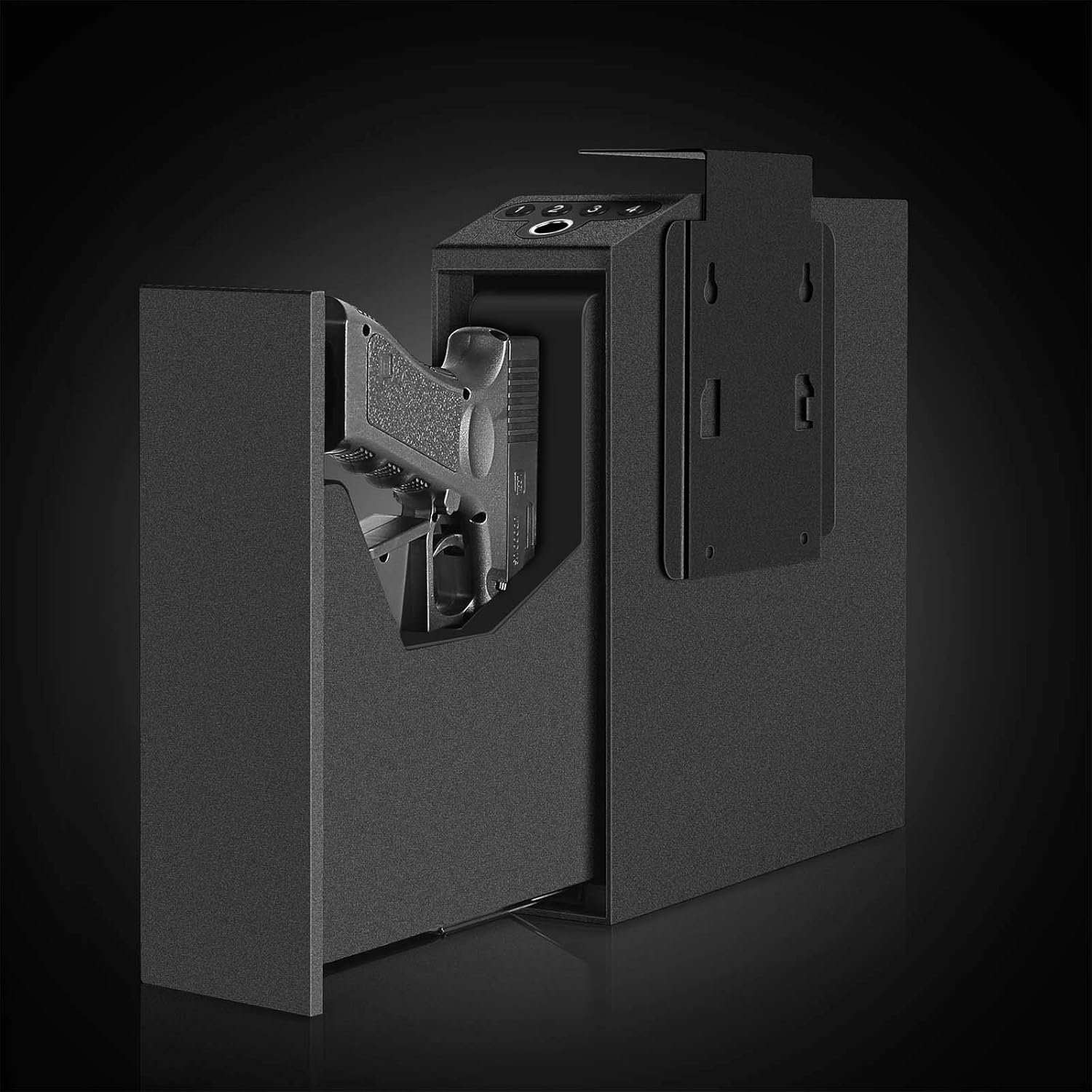Fits a handgun up to 9.5″ length ( almost all on the market). and 1 spare magazine. Allows for multiple mounting configuration from TOP, RIGHT, LEFT side or sit directly on the floor. Stores great under a desk or nightstand, discreetly on a bookshelf, on the wall, or inconspicuously in a vehicle.