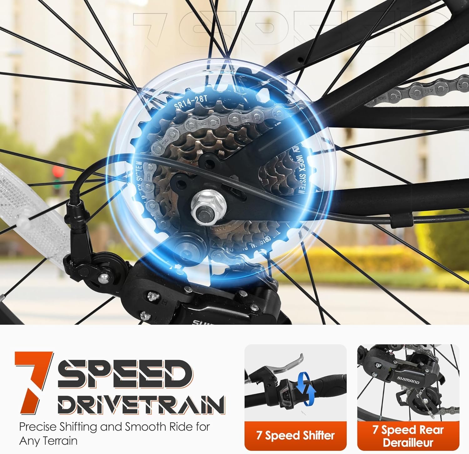【SMOOTH 7-SPEED GEARING】 Equipped with a professional 7-speed drivetrain, this Bonusall city commuter bike handles flat roads and moderate hills with ease. Enjoy precise shifting and a versatile riding experience tailored for urban environments.