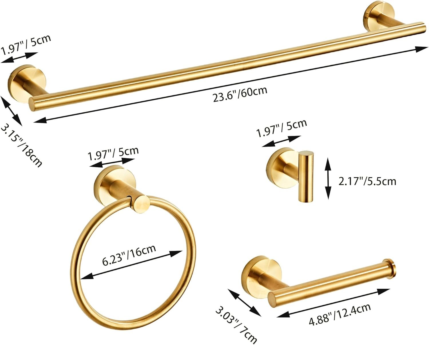 Convenient Set: Combines four essential bathroom accessories—1x 23.6-inch towel bar (fits 23.6″ wall stud), 1x toilet paper holder, 1x towel ring, and 2x robe hook—for a comprehensive upgrade.