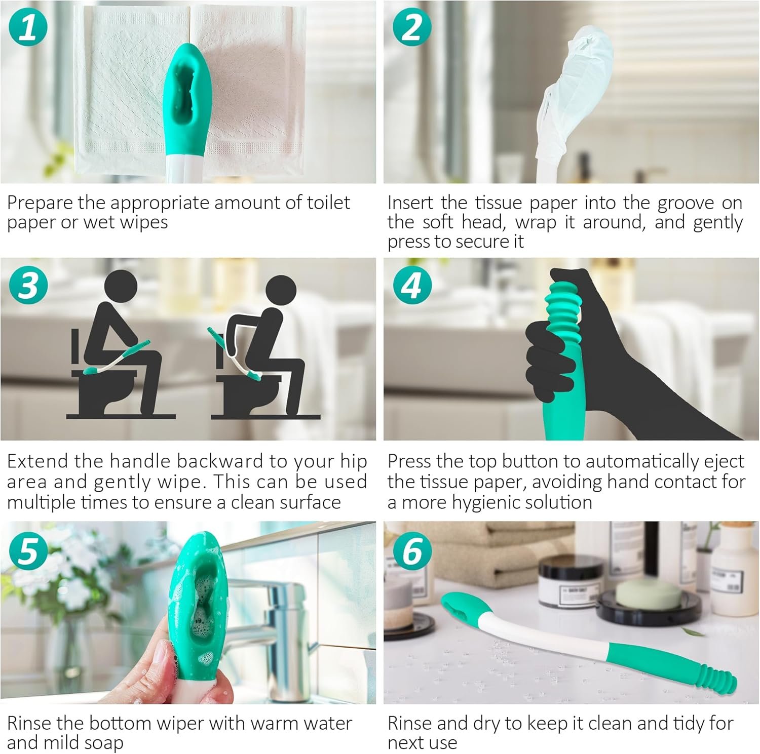 Easy to Use: This wiping aid for toileting can handle both dry and wet tissues. Simply wrap the tissue around the end of the wand and insert it into the groove. When finished, press the button at the end to automatically release the used tissue. This feature eliminates the need to touch the tissue after use, enhancing sanitation, butt wiper tool for men, bottom buddy, toilet aide for wiping bottom, toileting aids wiping wand