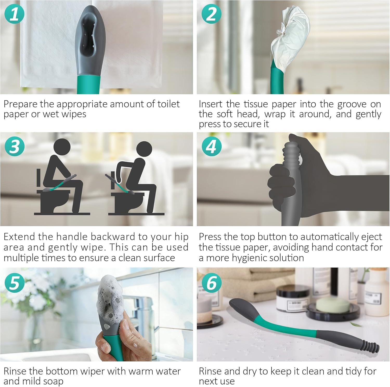 Easy to Use: Toilet aid suitable for both wet and dry tissues, simply wrap the tissue around the head and insert it into the slot. After use, press the button at the end to release the paper. This butt wiper ensures hygiene while saving tissue paper. It’s the perfect tool for maintaining cleanliness without hand contact, fitting perfectly in the personal hygiene products category, toilet wiping aid, butt wipers for seniors, but wiper for fat people