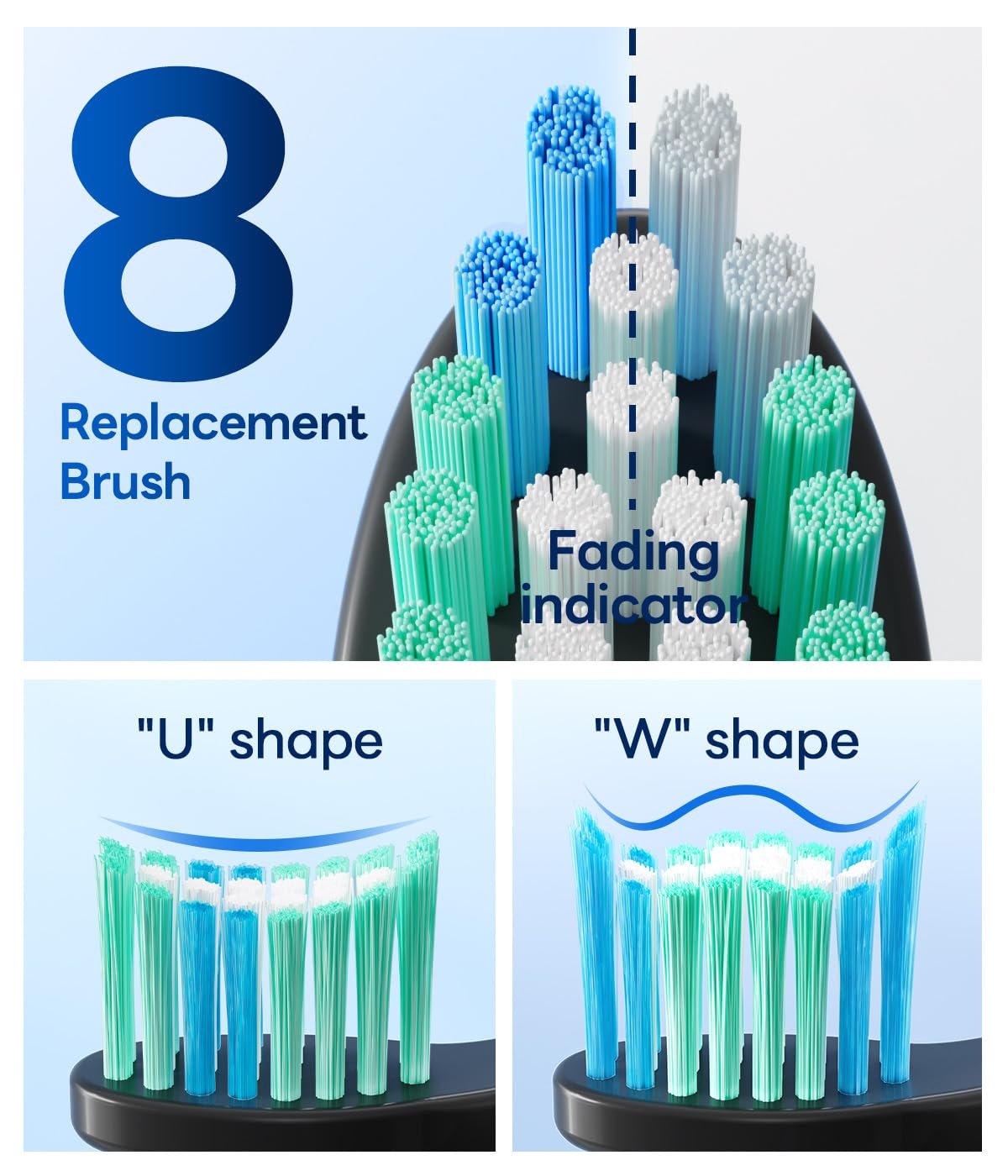 18 Months of Brush Heads Included Comes with 8 premium DuPont bristles—4 U-shaped and 4 W-shaped—designed for different gum and tooth needs. Fading reminder bristles help you know when it’s time to replace for optimal performance.