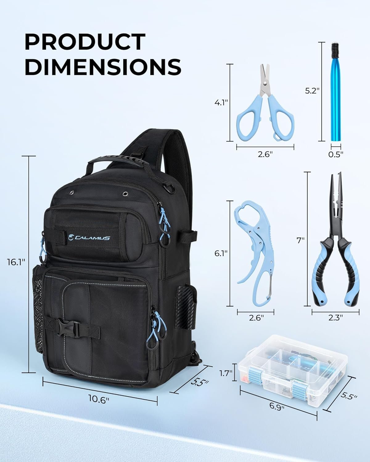 Calamus GearMaster Fishing Sling Tackle Bag & Tool Set, 3500 Tackle Box & Fishing Gear with Fishing lures, Fishing Pliers, Fishing Scissors, Lip Gripper, Wacky Tool