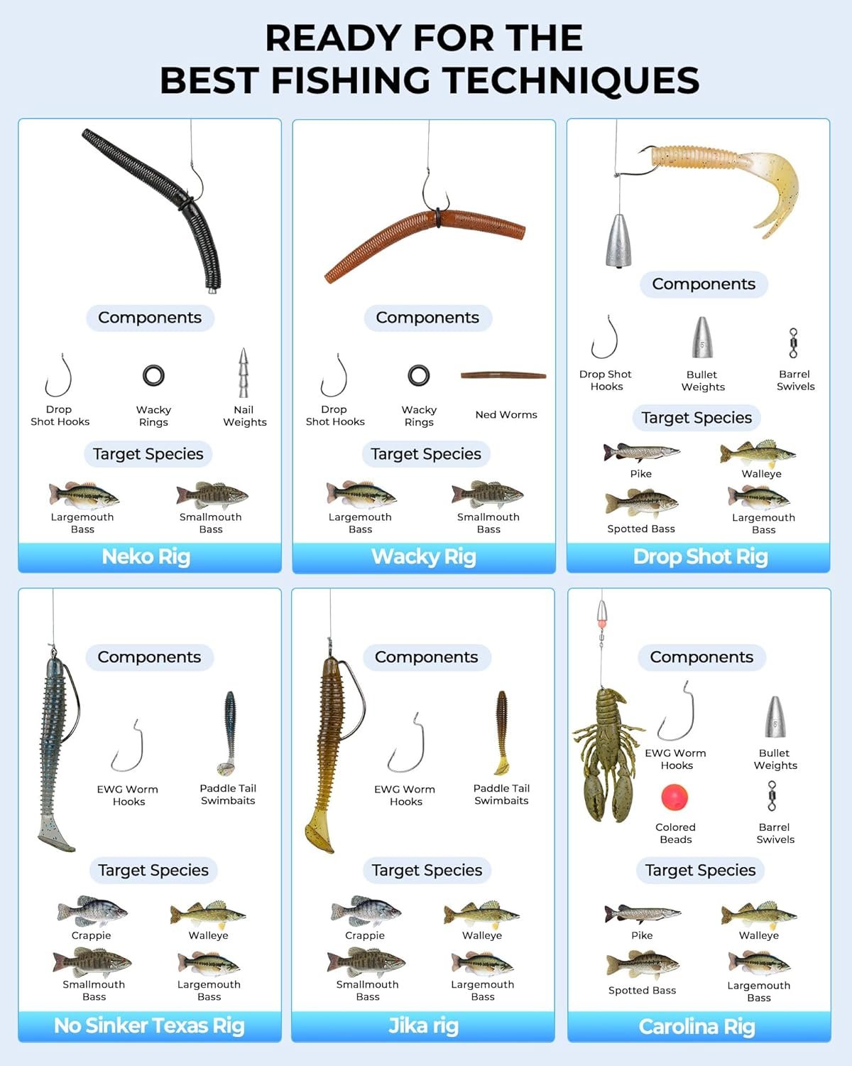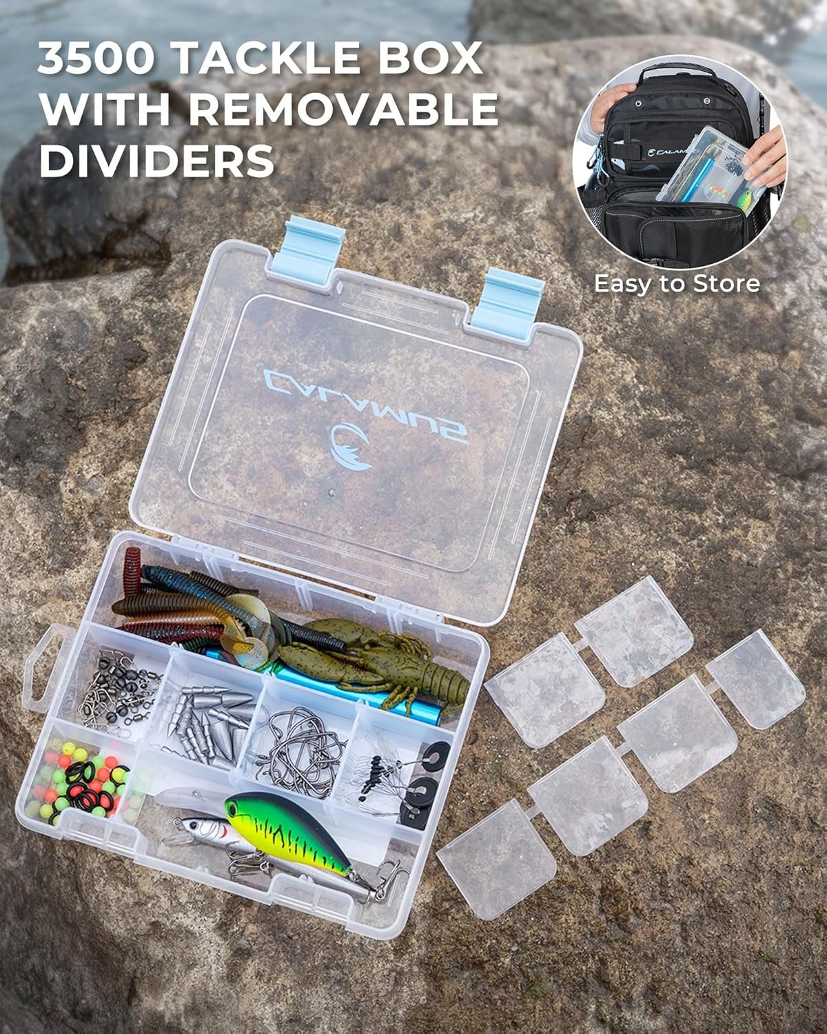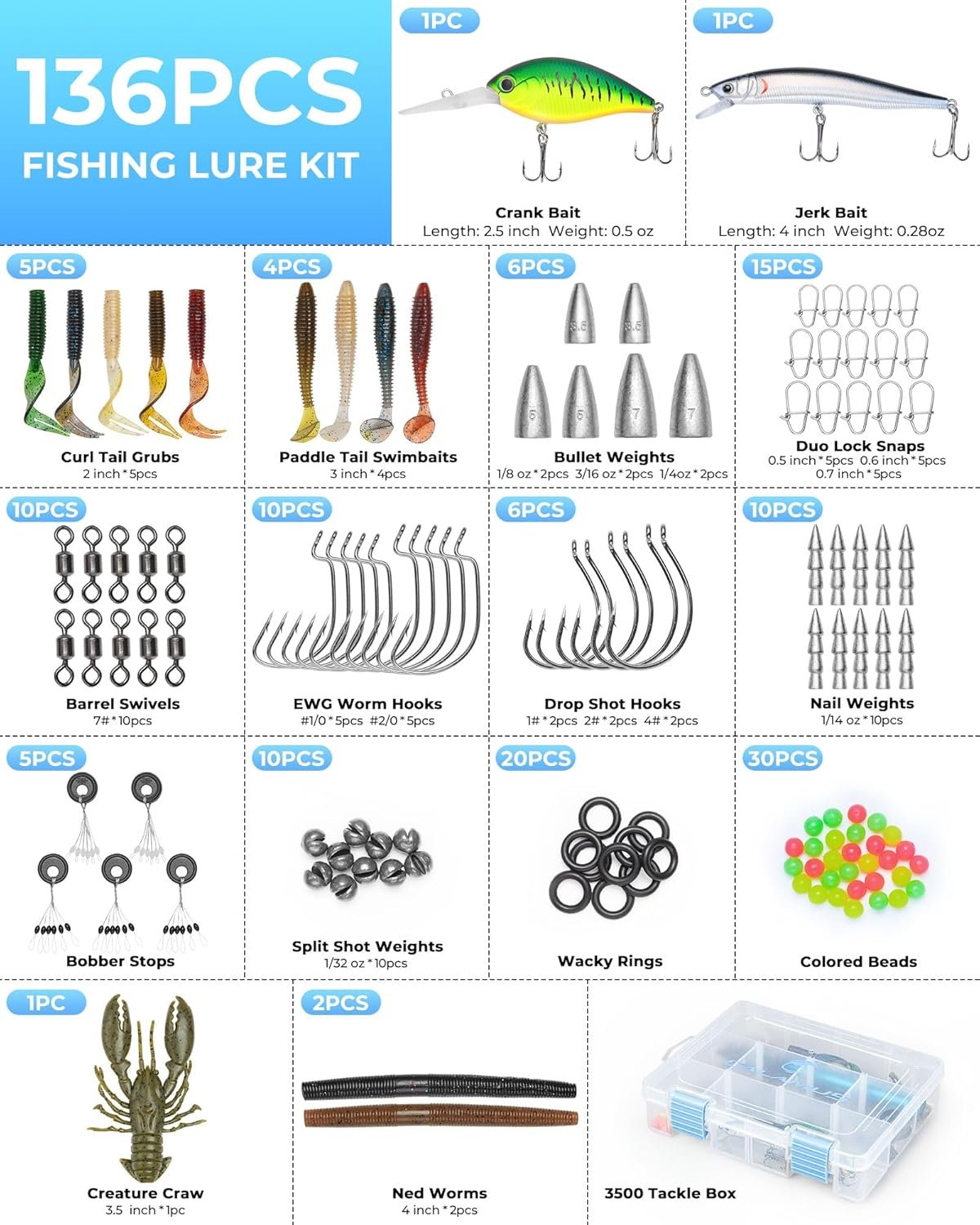 Fully Equipped Tackle Kit: Includes a 3500 tackle box loaded with a versatile assortment of fishing gear such as hard baits, soft plastics, hooks, sinkers, swivels, beads, O-rings, and more. Perfect for a variety of fishing techniques and water conditions.