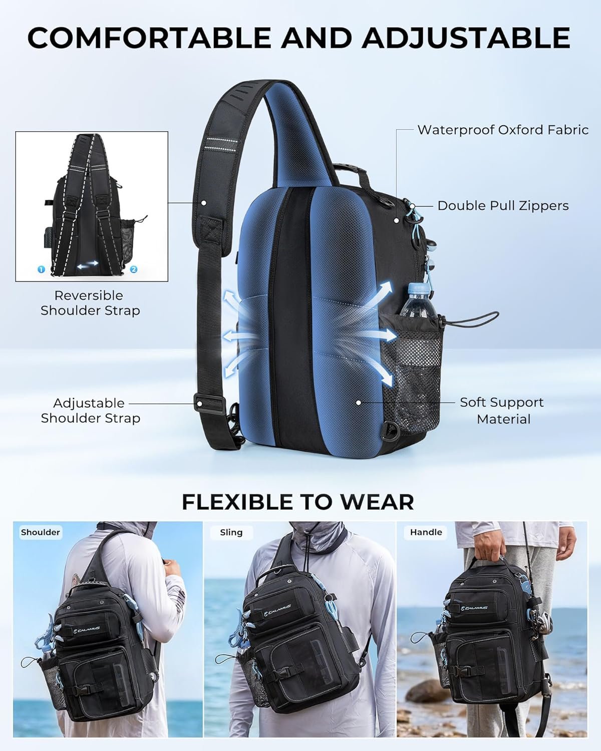 Comfortable & Adjustable Carry: Breathable padded back panel and adjustable shoulder straps provide all-day comfort while reducing fatigue. The adjustable sling design allows left- or right-side carry for balanced, stable movement when hiking, wading, or fishing.