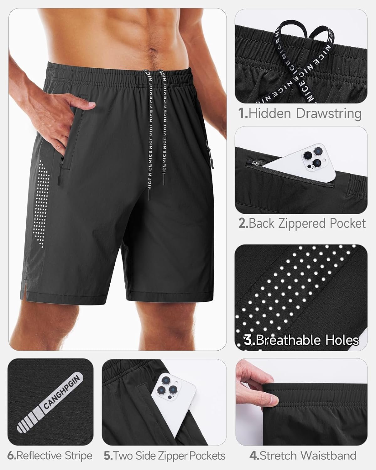 Men’s workout shorts use 4-way stretch fabric, ensure your training won’t get restricted!