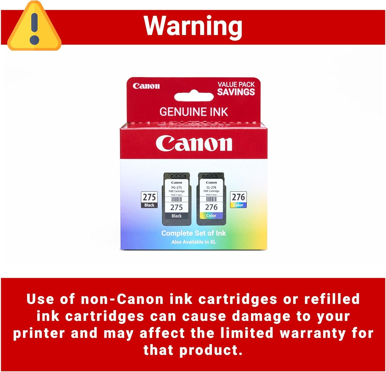 Value pack of 2 cartridges: PG-275 Black ink yields up to 100 pages, CL-276 color ink yields up to 100 pages.