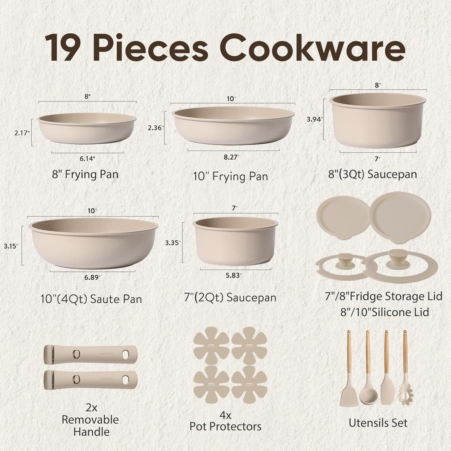 CAROTE 19pcs Pots and Pans Set Non Stick, Nonstick Cookware Set Detachable Handle, Induction Kitchen Cooking Sets with Removable Handle, RV Kitchen, Oven Safe, Taupe