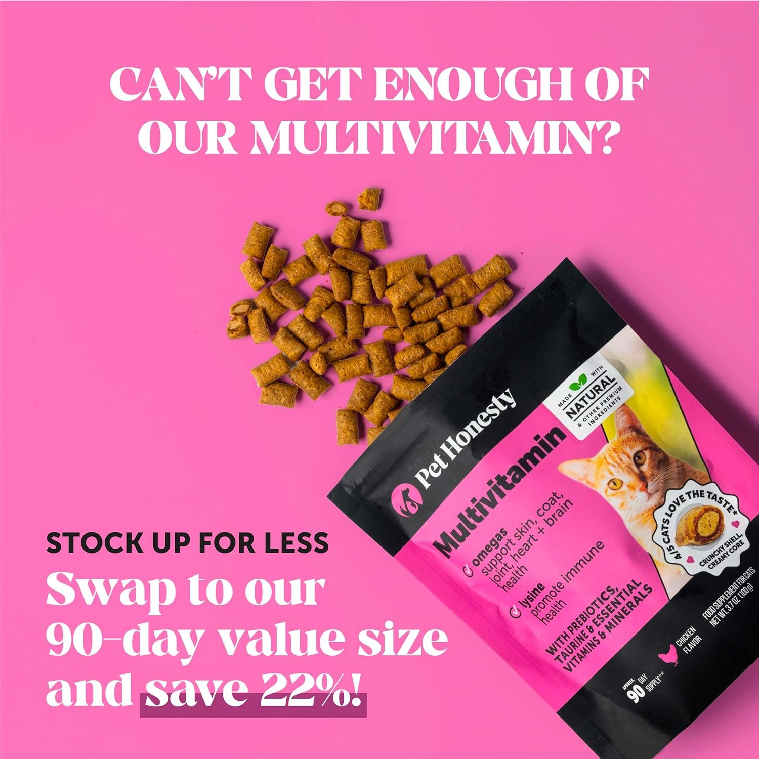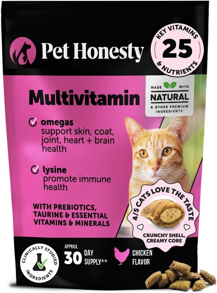 FROM TOP TO TAIL: Pet Honesty’s Multivitamin for cats is a crunchy, creamy supplement that they’ll think is a cat treat, but you’ll know better. These delicious little bites help boost cat health with big benefits. Not only do these healthy cat treats support overall immune, heart & gut health, they also promote healthy digestion & healthy skin & joints. Our cat food treats are made to help your furry family member live their best life, because that’s what they deserve.