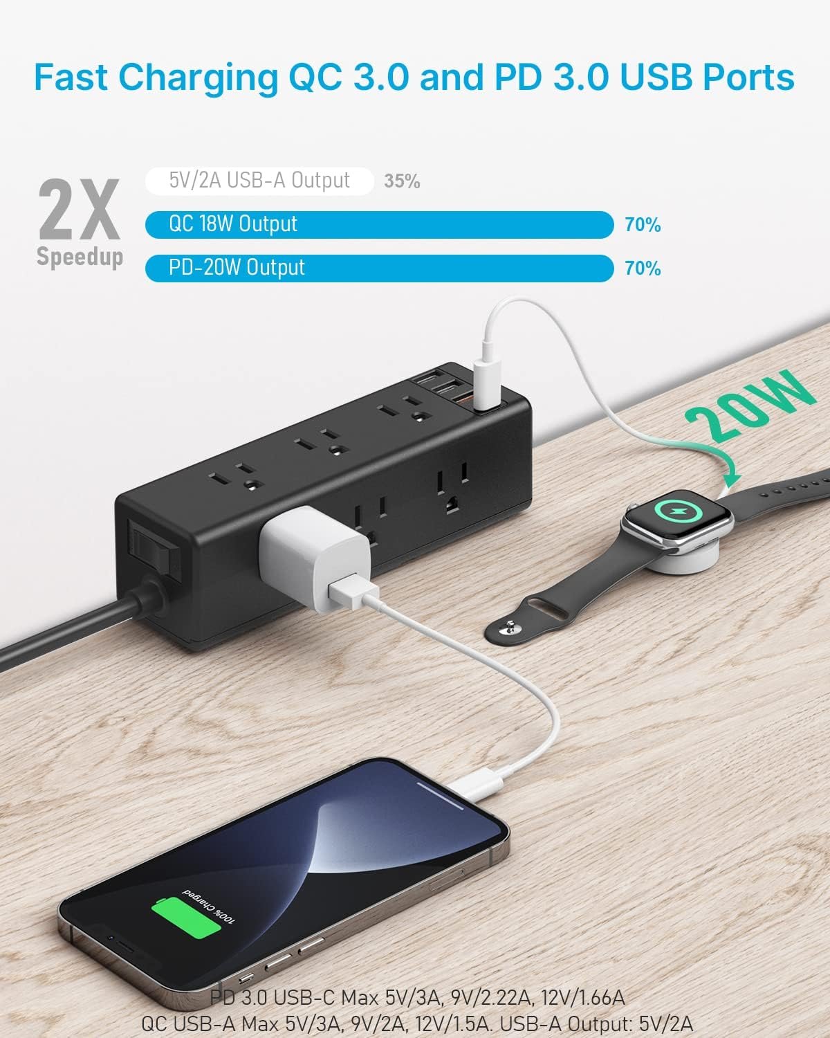 Desk electrical appliances organizer and accessories, desk plug with multi outlets can offer 125V/60HZ/12A/1500W output. QC3.0 USB-A Max 5V/3A, 9V/2A, 12V/1.5A. PD 3.0 USB-C Max 5V/3A, 9V/2.22A, 12V/1.66A (When use alone). Smart USB-A offer 5V/2A. Can run up to 13 devices.