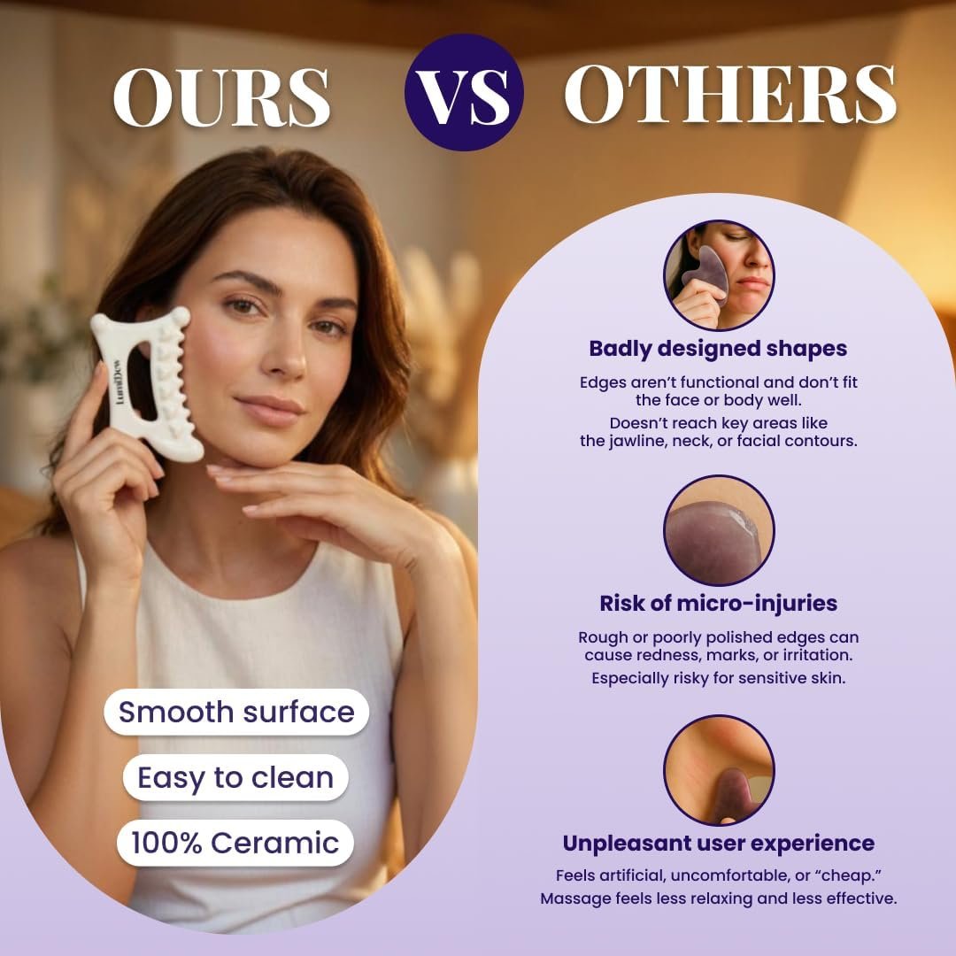EXPERIENCE THE SMOOTH CERAMIC: Unlike common jade or rough stone gua sha tools, our premium ceramic material glides effortlessly across your skin to prevent drag and irritation. It is the perfect gua sha facial tools for your delicate skin, providing an ideal cool temperature that helps reduce puffiness immediately.