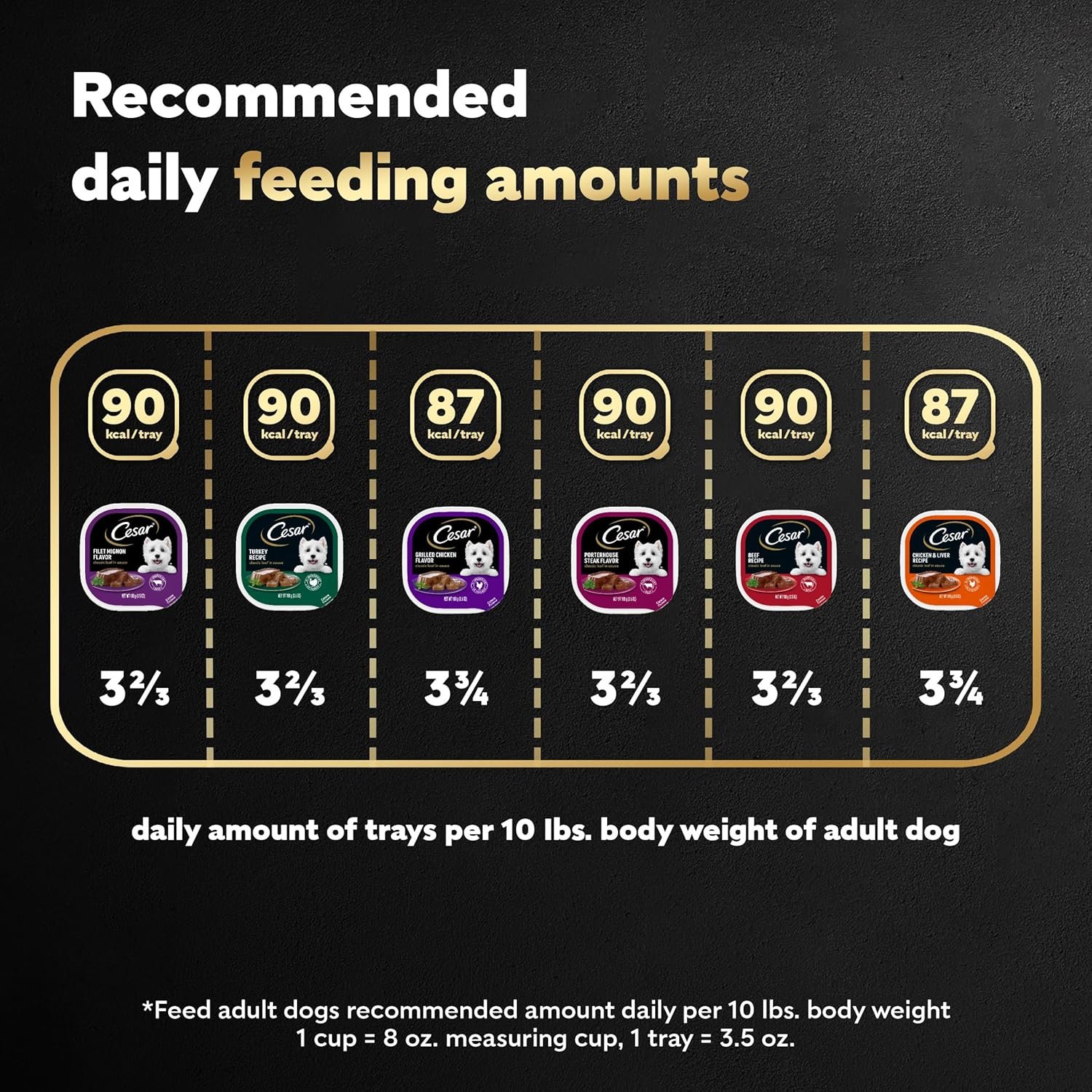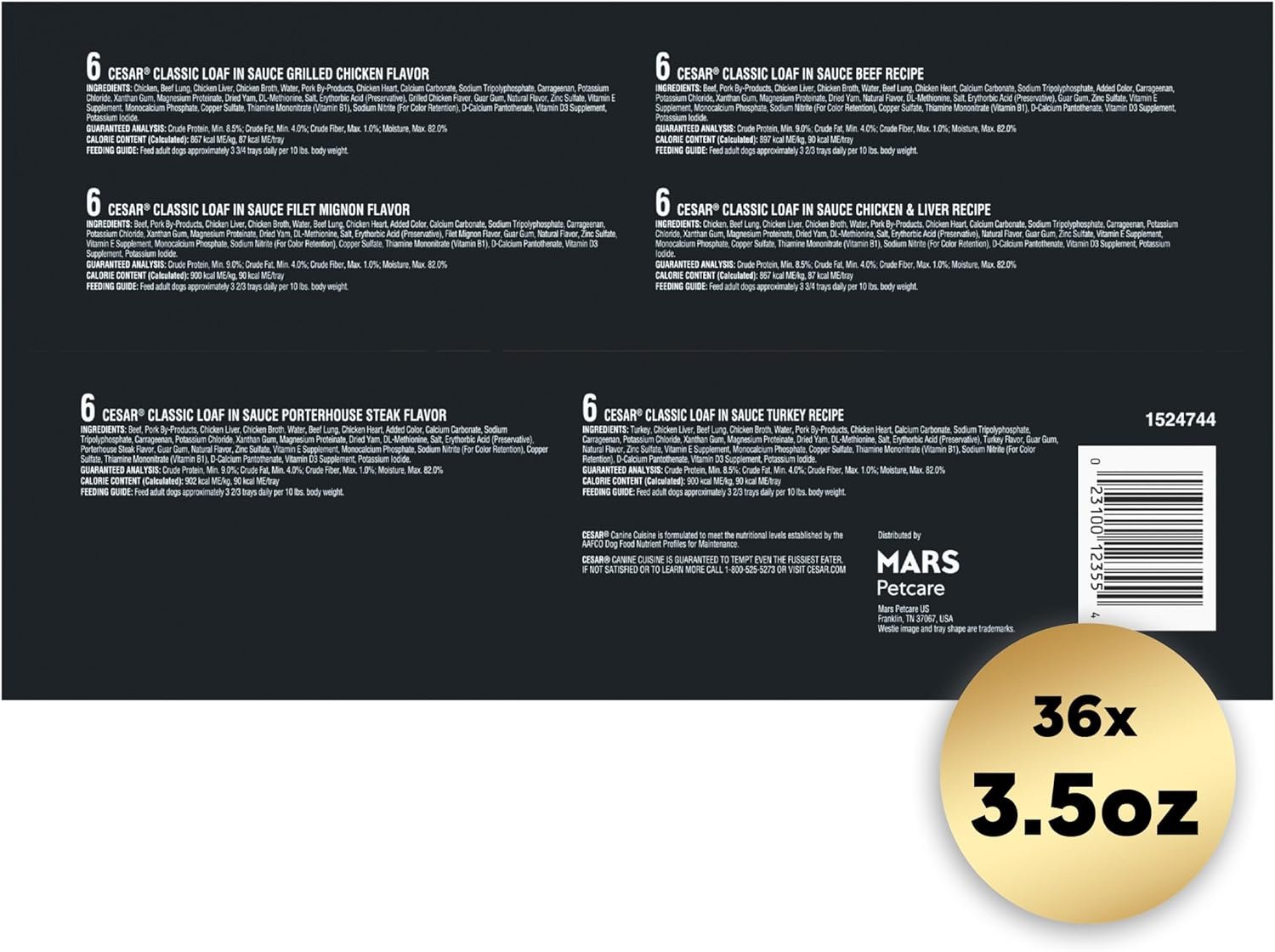 Cesar Wet Dog Food Classic Loaf in Sauce Grilled Chicken, Filet Mignon, Porterhouse Steak, Beef, Chicken & Liver and Turkey Variety Pack 3.5 oz. Easy Peel Trays (36 Count, Pack of 1)