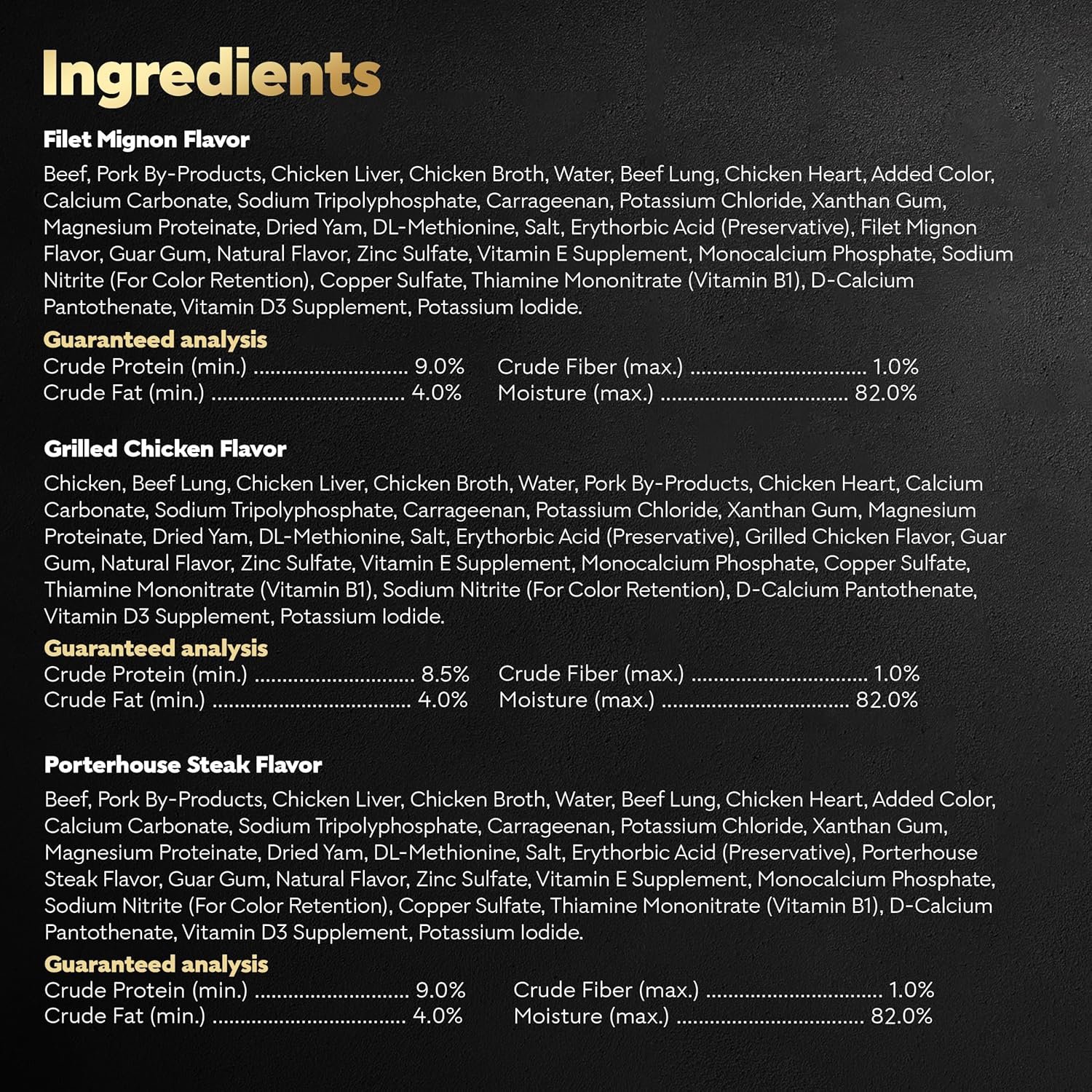 The Cesar brand knows that the best way to show your dog love is by keeping them happy and healthy with gourmet meals. With real meat as the #1 ingredient, Cesar Wet Dog Food Classic Loaf in Sauce Grilled Chicken, Filet Mignon, Porterhouse Steak, Beef, Chicken & Liver and Turkey Variety Pack gives your dog great flavor and a delicious meal. This product contains no fillers, no artificial flavors, and is formulated without grains*. Made in the USA with the finest ingredients from around the world, you can be sure your best friend is getting a high quality meal. This gourmet soft dog food is also served in convenient trays with easy peel away seals. Thanks to Cesar, you can give your dog a healthy meal that they will love and love you for (*Trace amounts may be present due to cross-contact during manufacturing).